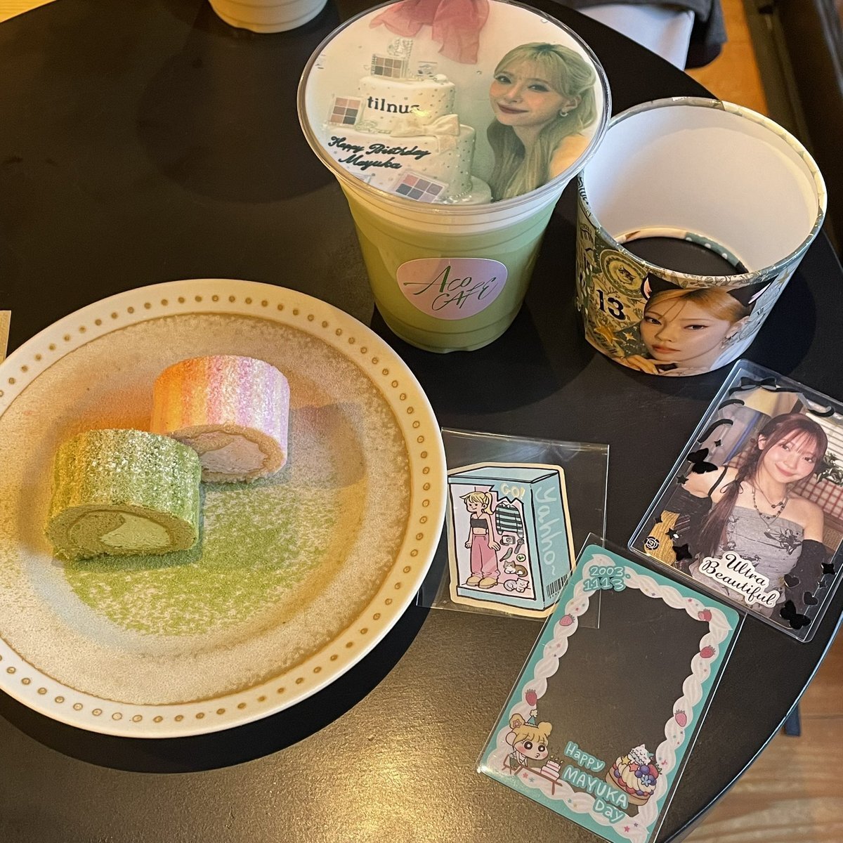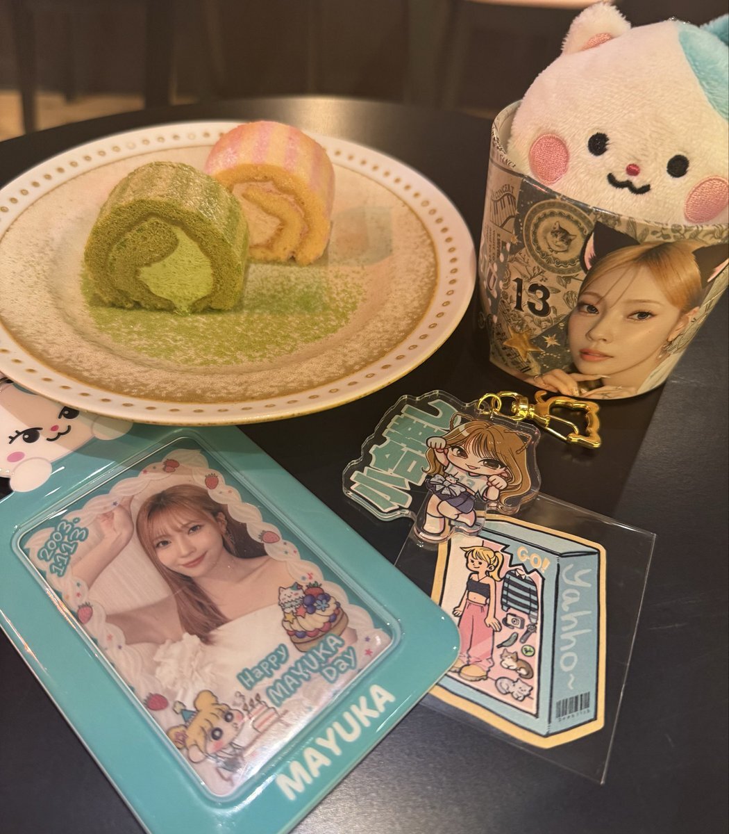 マユカちゃんのセンイルカフェでACO CAFEさんへお邪魔してきました💚🐈⬛ 飾ってある写真ぜーんぶ可愛くて、カップホルダーもステッカーもカードフレームもめちゃ素敵で幸せ空間✨ クマユカロールケーキも美味しかった🥰 #HappyMAYUKADay #まゆちのハート掴めばWinner #カフェの中に忍び込めば pic.x.com/pOBowCJe71