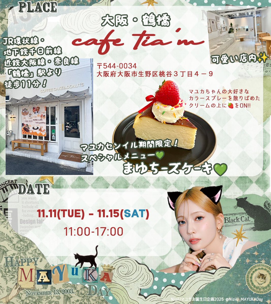 🐱センイルカフェイベント2025☕️ 🎂大阪 鶴橋🎂 💚cafe tia'm💚 JR・地下鉄各線 鶴橋駅 🗓️11/11(火)〜15(土) 📍maps.app.goo.gl/GgtEReAZN3aRQn… X🔗x.com/CafeTIAM インスタ🔗instagram.com/cafetiam_coffe… ⚠️お問い合わせは当アカウントDMまでお願いいたします🙇♀️ #NiziU #MAYUKA #マユカ x.com/NiziU_MayukaDa…