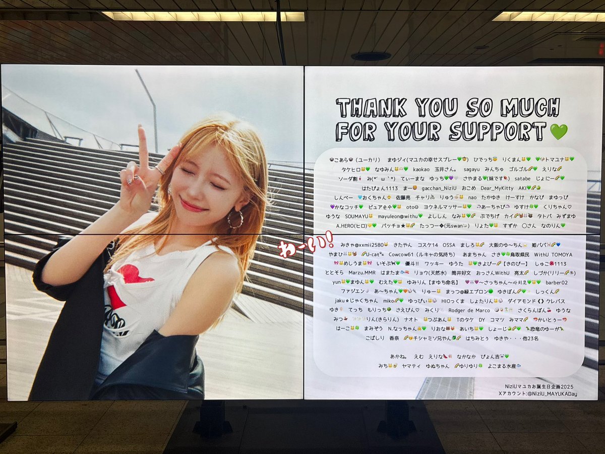 名駅のビジョン広告発見!!🎬かなりの頻度で流していただいてる、、、すごい! まゆちゃんの魅力が詰まってて𝑩𝑰𝑮 𝑳𝑶𝑽𝑬が止まりませんでした💚💚🐈⬛ ありがとうございました✨✨ #MAYUKA #マユカ #MAYUKA_bubble 🐱💚 #HappyMAYUKADay #まゆちのハート掴めばWinner pic.x.com/RU5HqGotzT x.com/amy___d/status…