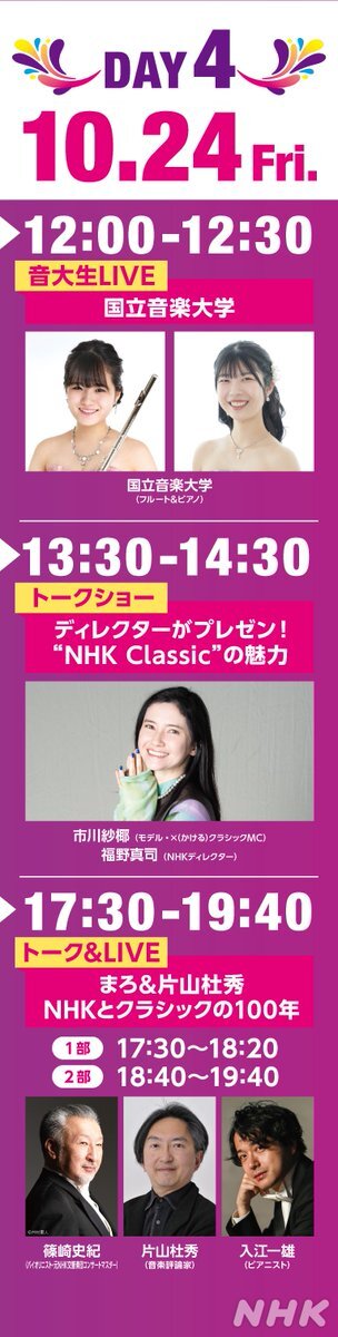 #NHKClassic Fes.2025🎉 明日24(金)はこちら! 🎹12:00~【LIVE】#国立音楽大学 Fl #成川結衣 Pf #角南紅葉 🎤13:30~【トークショー】 #市川紗椰 &NHKディレクター 🎻17:30~【トーク&LIVE】 #まろ こと #篠崎史紀 #片山杜秀 #入江一雄 (後日一部放送予定) HP👉️nhk.or.jp/event/ongakusa… pic.x.com/QFLsd5SABG
