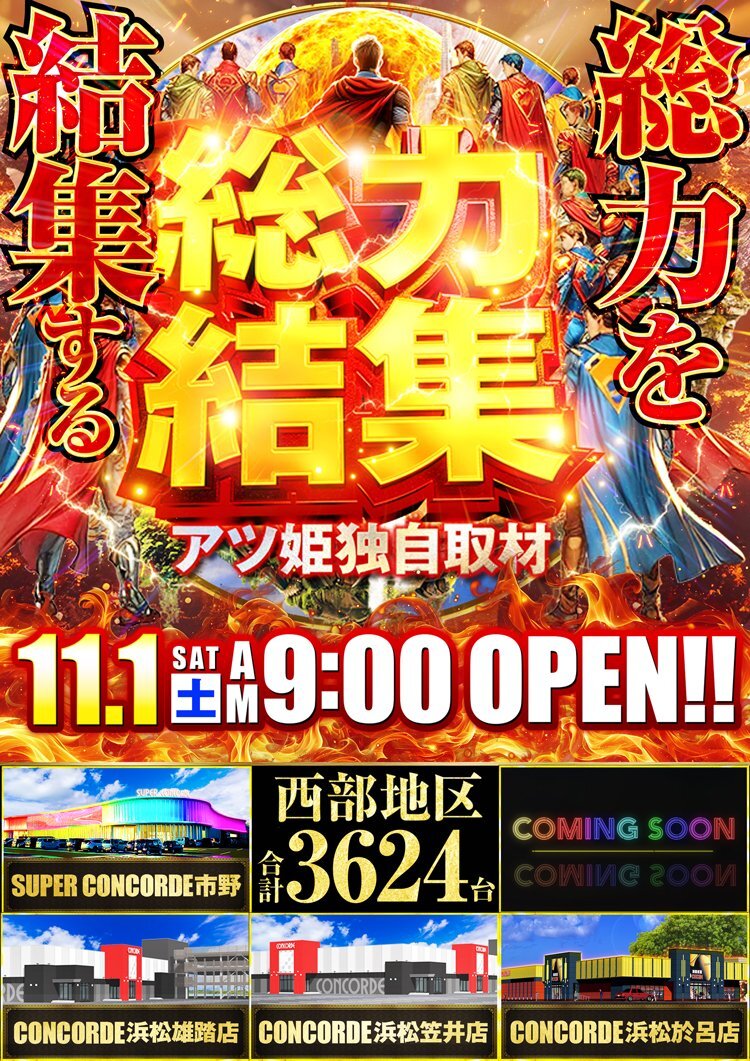 ⭐️11/1[Sat] AM9:00 OPEN! 🌟浜松コンコルド4店舗🌟 💪🏽総🌟力💪🏽結🌟集💪🏽 🔥🔥🔥🔥🔥🔥🔥🔥 ✨店を超えて集う瞬間✨ 👑4つの力が結集する👑 🔥🔥🔥🔥🔥🔥🔥🔥 ⏬⏬⏬⏬⏬⏬⏬ 💋ぱちかす超人。 💋【#まろ】さん来店予定‼️ 👉@pachinko_malo 📢ご来店お待ちしております😁 pic.x.com/sAL7x1vwBx