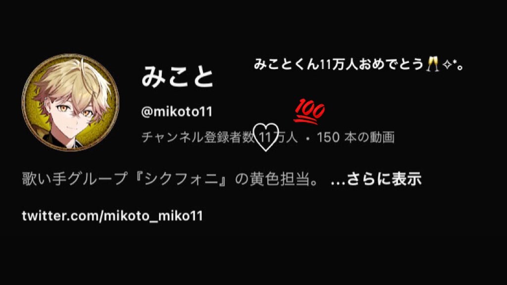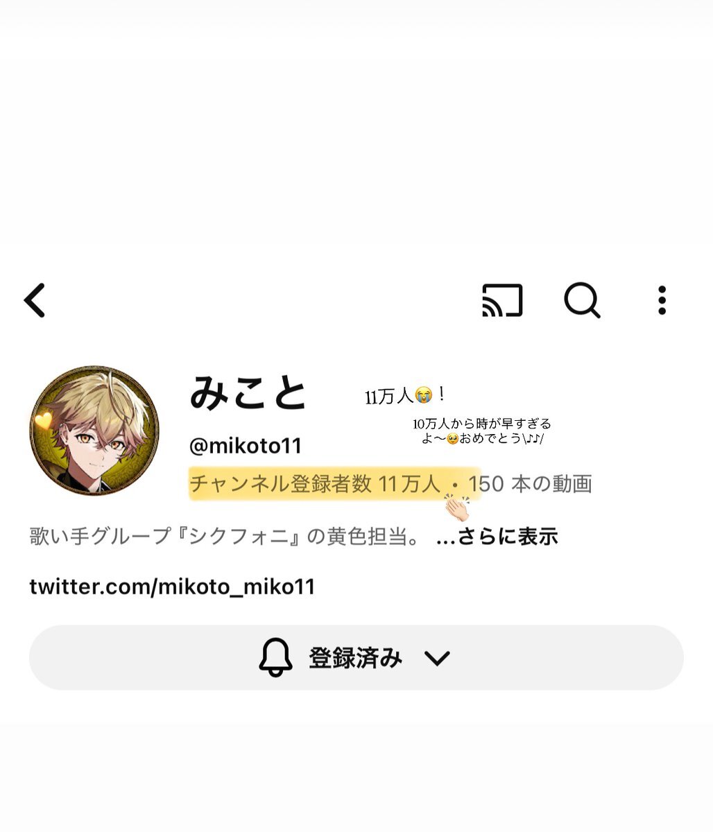 みことくん11万人おめでとう~!!😽💛 次は12万人‼️‼️みことくんの歌声がもっとたくさんの人に知ってもらえますように💫❤︎ #みことの民 pic.x.com/TX13MxZpVv