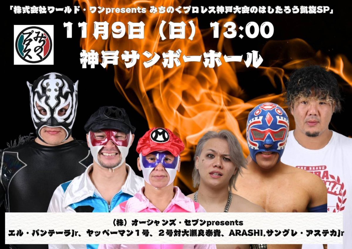 “今”のみちのくプロレスを神戸に⚓️ 【セミ】(株)オーシャンズ・セブンpresents エル・パンテーラJr.、ヤッペーマン1号、ヤッペーマン2号 vs 大瀬良泰貴、ARASHI、サングレ・アステカJr. #みちプロ神戸 pic.x.com/uRkuBNSh4r