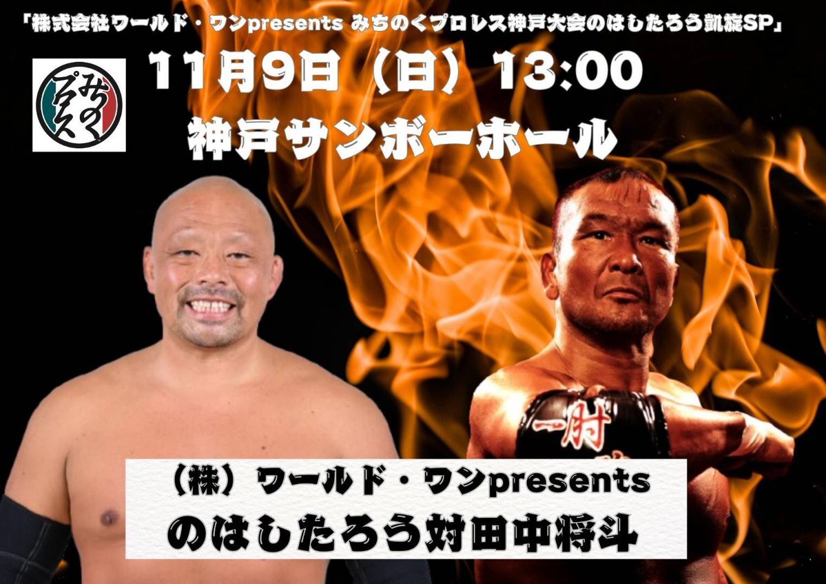 本日、発表となりました。 (株)ワールド・ワンpresents のはしたろう vs 田中将斗 田中さんへの想いはまた改めて…。 #みちのくプロレス #みちプロ神戸 #KOBE #神戸 x.com/kankoutaishi_n…