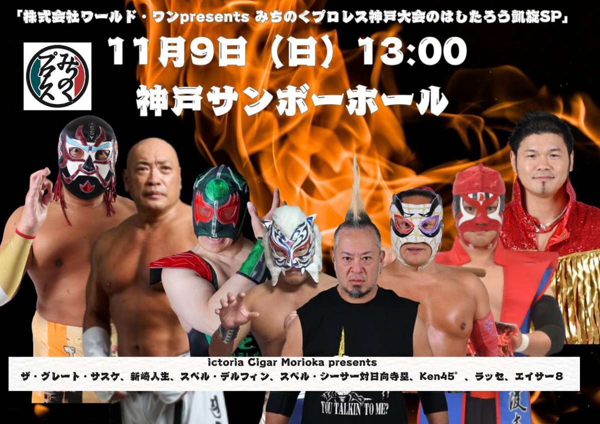 【第4試合】 Victoria Cigar Morioka presents ザ・グレート・サスケ 新崎人生 スペル・デルフィン スペル・シーサー vs 日向寺塁 Ken45° ラッセ エイサー8 #みちプロ神戸 pic.x.com/YP6HAfGlBY