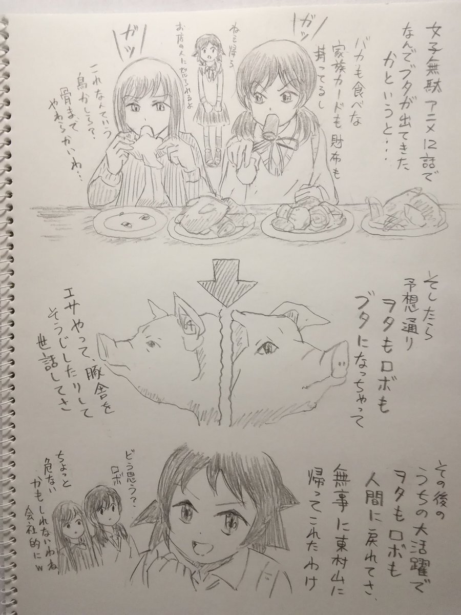 #みなさん6年前の今頃はどんな絵描いてましたか 6年前の今頃は心臓手術後の入院中に #女子高生の無駄づかい 12話ブタさんネタマンガをスケッチブックに描き、写真に撮って投稿しました(4枚目)。#千と千尋の神隠し &スタジオ〇ブリネタだとわかる人はどんどん減ってるんでしょうねぇw #女子無駄 pic.x.com/J2Ut6emH0p