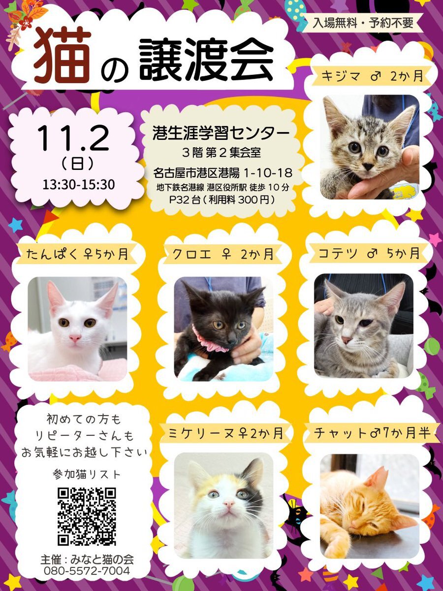 11月2日に名古屋市港区でネコちゃんの譲渡会が開催されます✨🐱✨新しいご家族の皆様とネコちゃん達に素敵な出会いとご縁がありますようにと願っております🍀🕊️🍀 #みなと猫の会 さん #猫の譲渡会 #名古屋市港区 #港生涯学習センター さん x.com/minatonekonoka…
