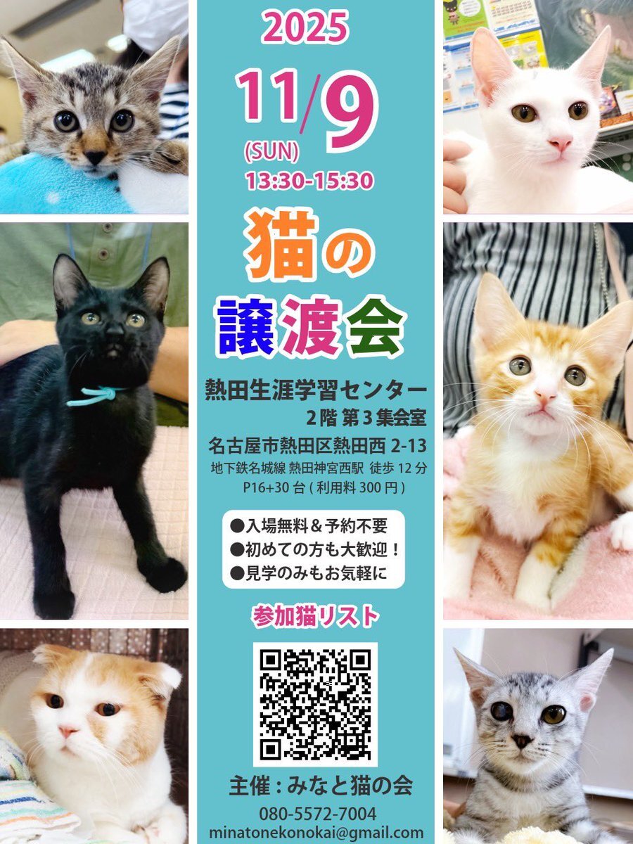 11月9日に名古屋市の熱田区でネコちゃんの譲渡会が開催されます🩷🐱🩵新しいご家族の皆様とネコちゃん達に素敵な出会いとご縁がありますようにと願っております🍀🕊️🍀 #みなと猫の会 さん #猫の譲渡会 #名古屋市熱田区 #熱田生涯学習センター さん x.com/minatonekonoka…