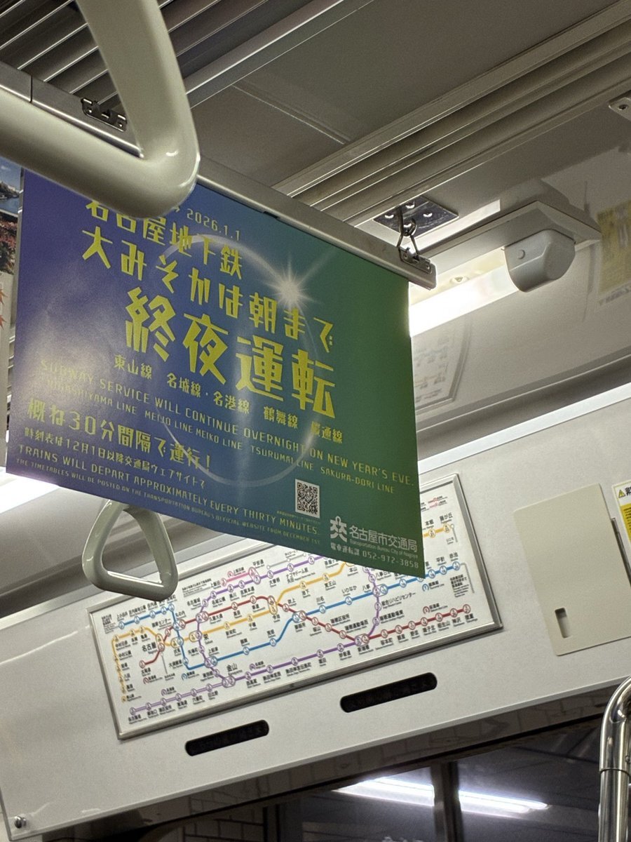 地下鉄は大晦日から元旦にかけて30分間隔で運行予定!メインの名古屋市内は余裕で移動できますね✨ 名古屋市以外組で地下鉄→乗り換えの私はJR、名鉄はやらないので車を安く停められるところを予約しよ! #超能力戦士ドリアン #みんなで年越し楽しいな 当たるつもりでいてるけど当たるよね? x.com/durian_officia…