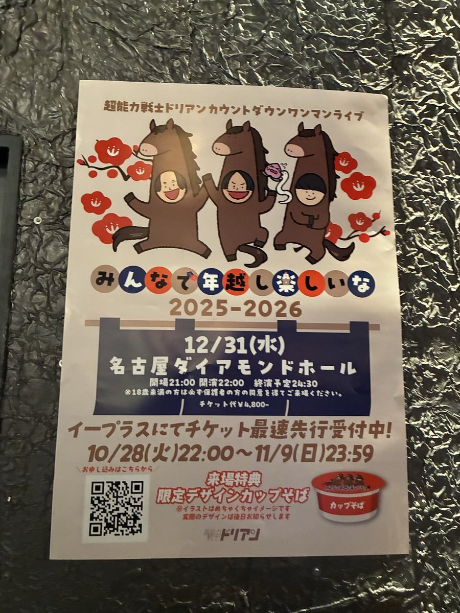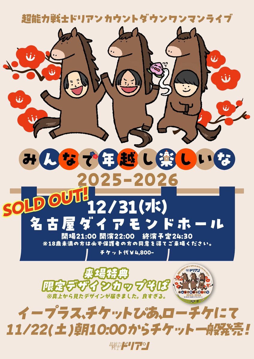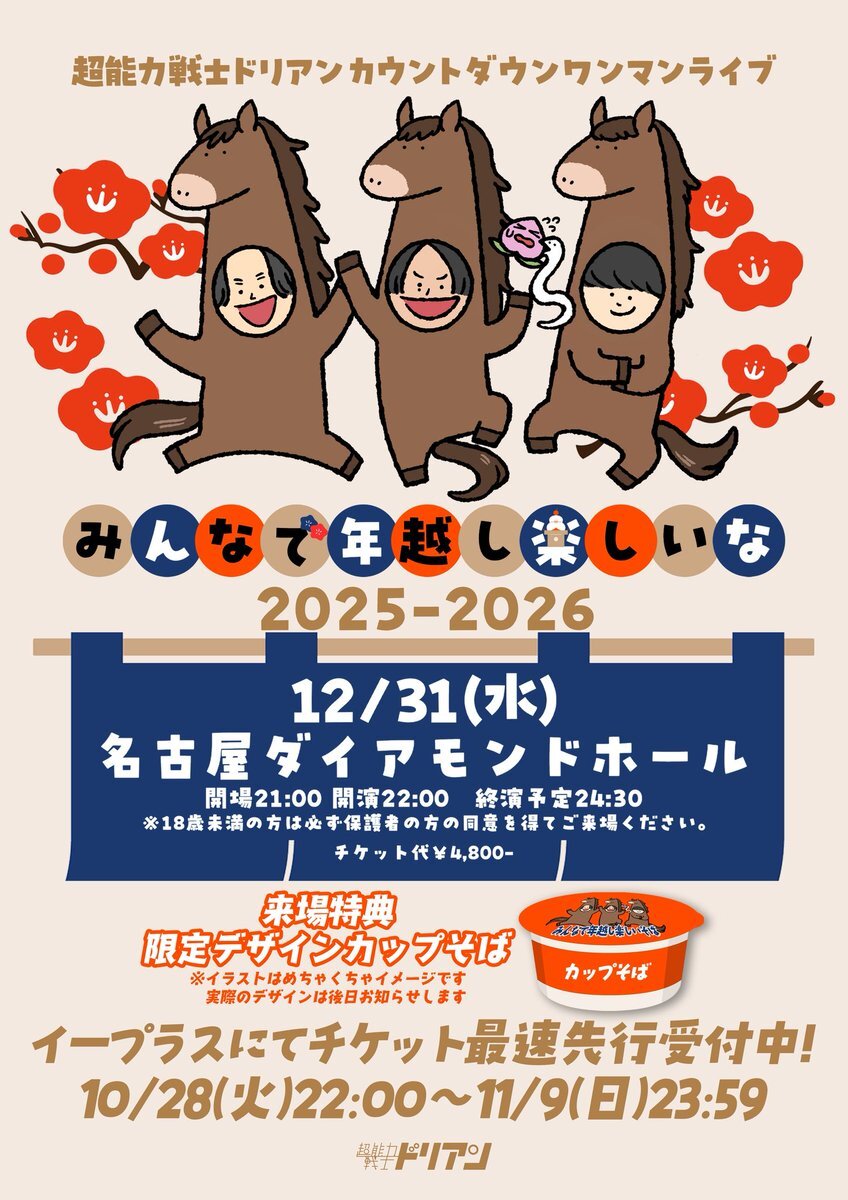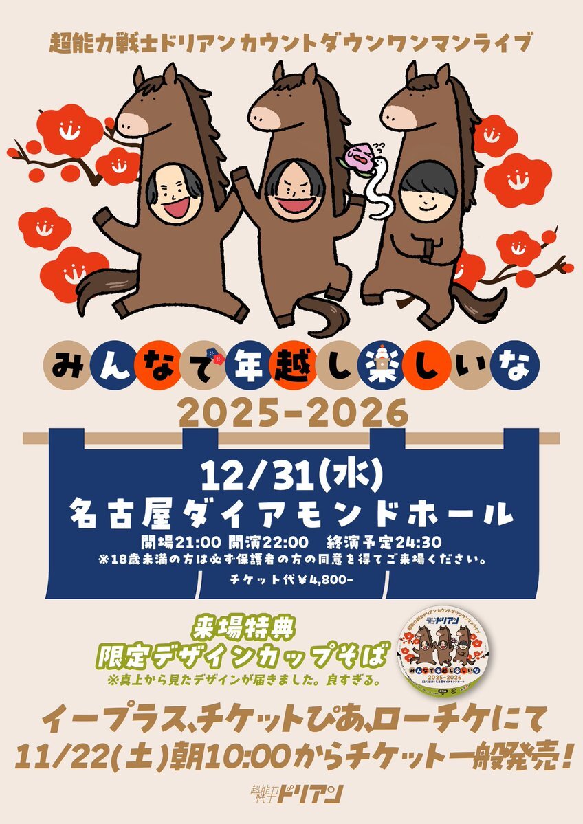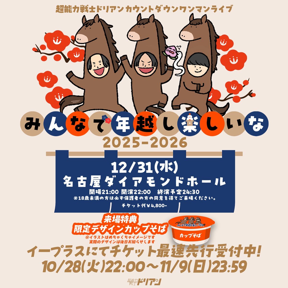 超能力戦士ドリアン カウントダウンワンマンライブ みんなで年越し楽しいな2025-2026 12/31(水)名古屋ダイアモンドホール 譲 最速先行チケット 3枚 求 定価+手数料 リプライ又はDMでご連絡下さい #超能力戦士ドリアン #みんなで年越し楽しいな