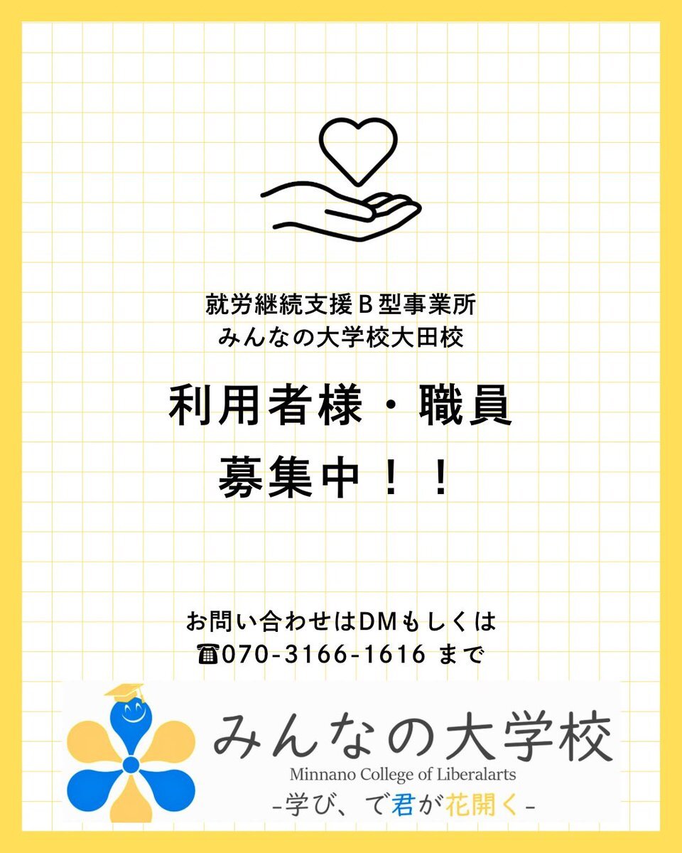 「みんなの大学校」 興味ある方はぜひ!! #みんなの大学校 #就労継続支援B型 x.com/mindai_ohta/st…