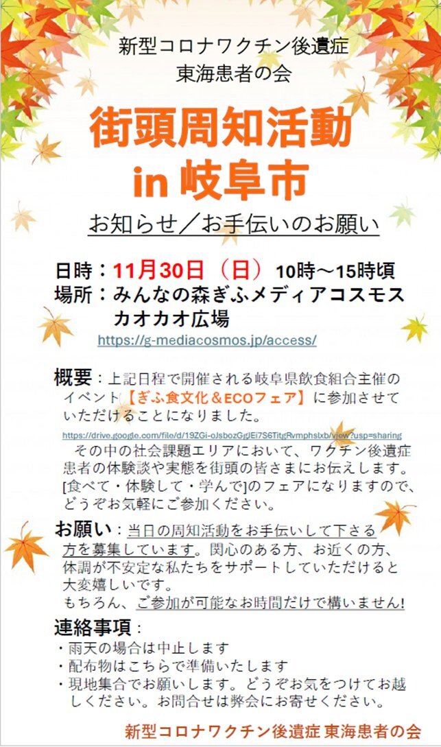 【お知らせ/お手伝いのお願い】 岐阜市で行われる下記フェアで周知活動をします! ・[ぎふ食文化&ECOフェア] 内ブース drive.google.com/file/d/19ZGi-o… ・11月30日(日)10時~15時頃 ・みんなの森 ぎふメディアコスモス ・[街頭周知活動チラシ] drive.google.com/file/d/1GTrBTx… #岐阜 #イベント #ワクチン