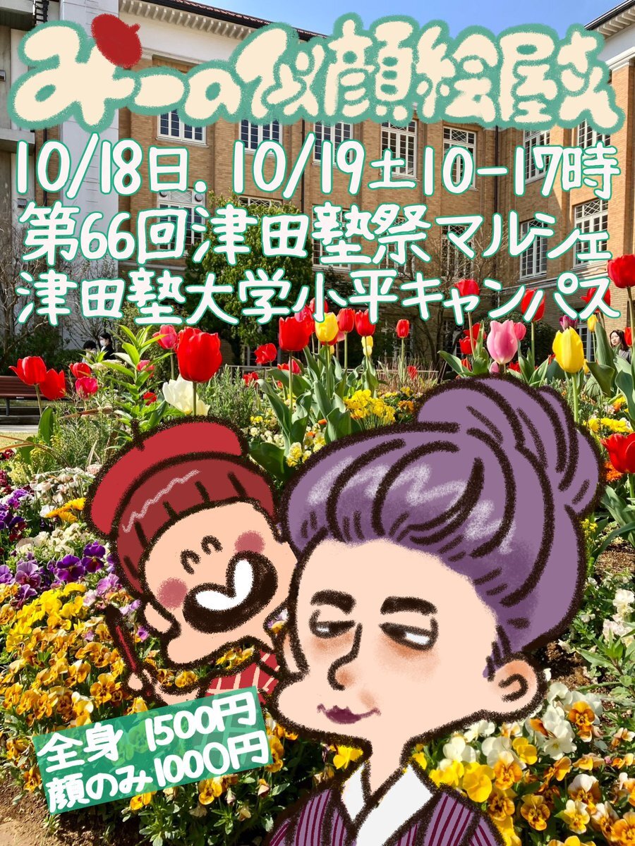 【告知】 #みーの似顔絵屋さん🎨 10.18土-19日 10:00~17:00 第66回津田塾祭マルシェ( @tsudajukusai ) 津田塾大学小平キャンパスでやります👨🎓 今年も呼んでもらえました🥹✨️ 一般の方も入場可能ですのでぜひ🙆♂️✨️ 顔のみ¥1000👧 全身¥1500👫 アクセス maps.app.goo.gl/suEWo9FAWNVKkp… #津田塾祭