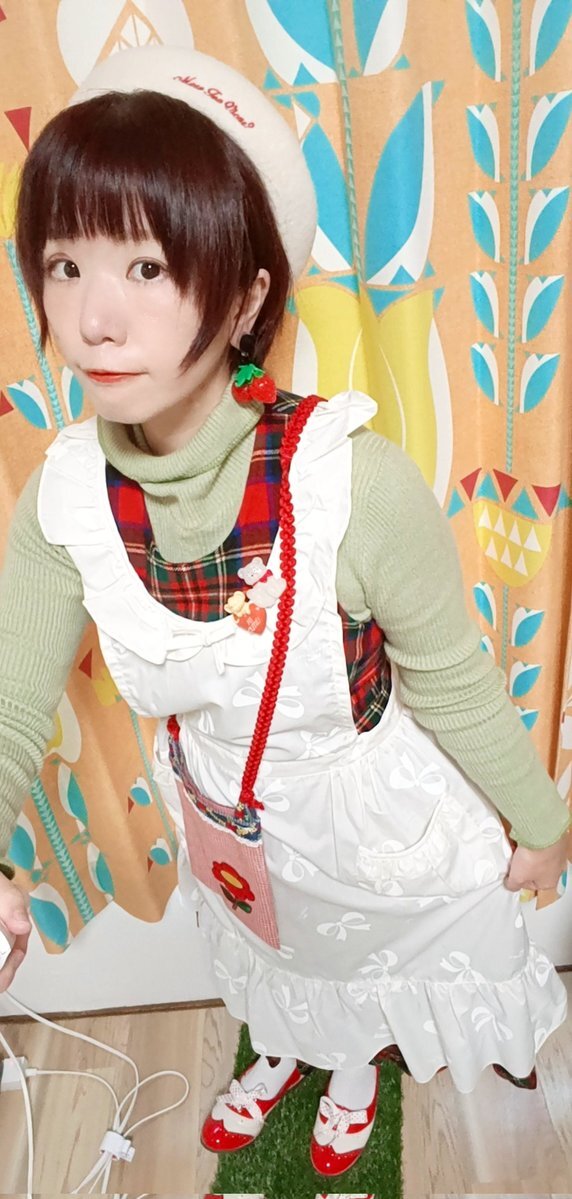 おはようございます🌞 本日は #みーの似顔絵屋さん🎨 中野ブロードウェイ@AmanojaKu620 さん👼です Amanojakuさんでお迎えしたエプロンを着ました🎀 チェックのワンピース👗 ベレー帽👒 パンプス👠 いちごピアス🍓 @MoreTeaVicar512 さん🫖 @grandpries さん📺️の生地で作ったポシェット👜 pic.x.com/bigKMFLcln x.com/meey_3kura1206…