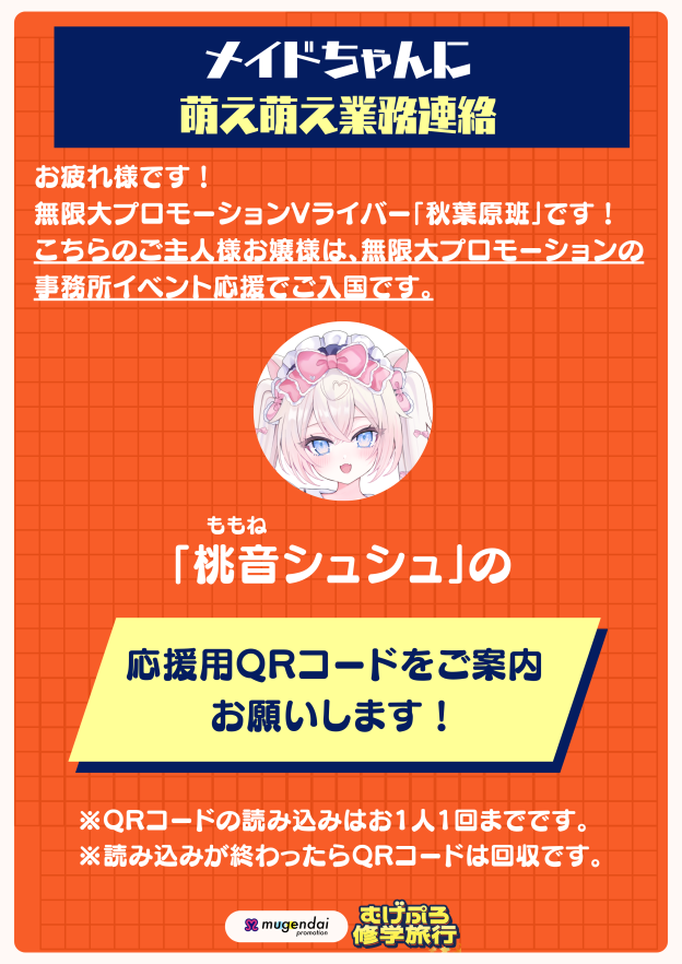 🍁むげぷろ修学旅行⛩️ ご主人様お嬢様へねねからのお願いです‼️ 1. 秋葉原にある実店舗へのご入国時に添付画像をメイドちゃんに見せる🤚 2. 配ポス時に #むげぷろ修学旅行秋葉原班 をつける📮 3. リアグをもって秋葉原で写真を撮る🤳 ALTに詳細記載してありますのでご確認ください! pic.x.com/i6E2CCETYa x.com/mugendaipro/st…