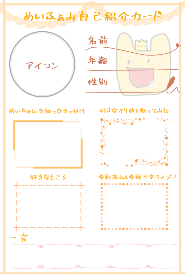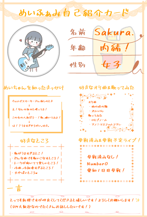 めいふぁみさん用の自己紹介カードのテンプレート作りました! 2枚目は例です! 投稿の際は #めいふぁみ自己紹介カード をつけてお願いします! 自由に使ってOKです! ※修正があったので再投稿です! #めいふぁみさんと繋がりたい #めいふぁみと繋がりたい #めいふぁみ自己紹介カード pic.x.com/OaBjqwwlFD