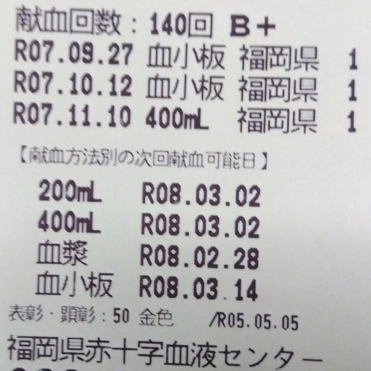 成分献血の回数上限到達から 全血ぬいて 春まで打ち止め 物理カードの更新もこれでおしまい キリのいい数字ではある 一番必要とされるであろう冬季に まるごと行かれんとか阿呆らしいの あとは任せた #やってみらん献血 #献血 pic.x.com/fF5DV6GS53