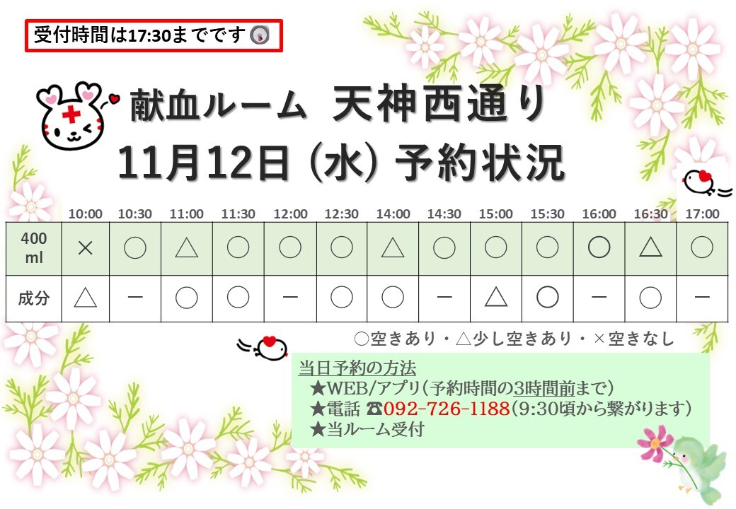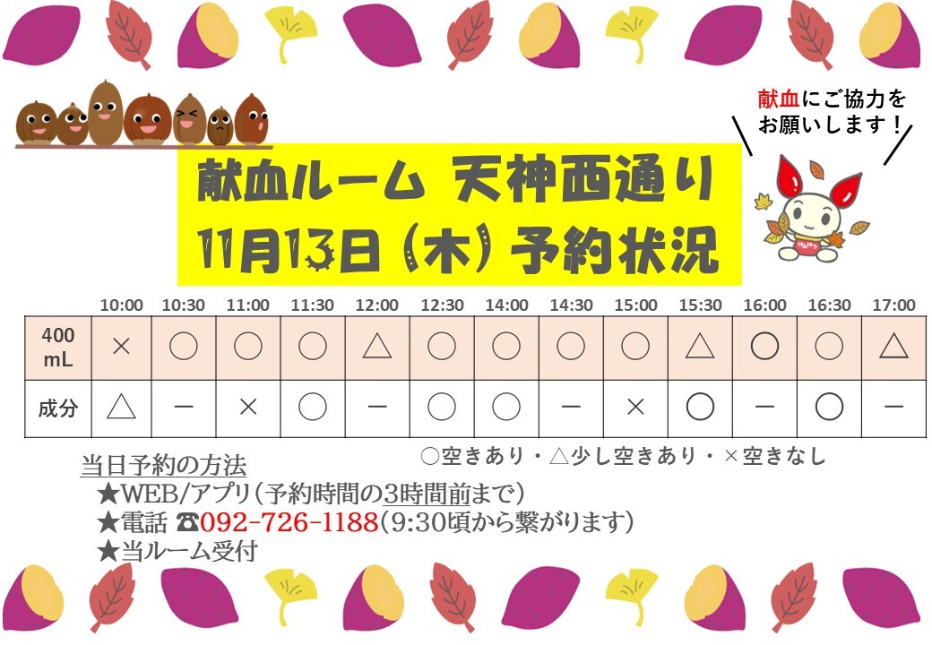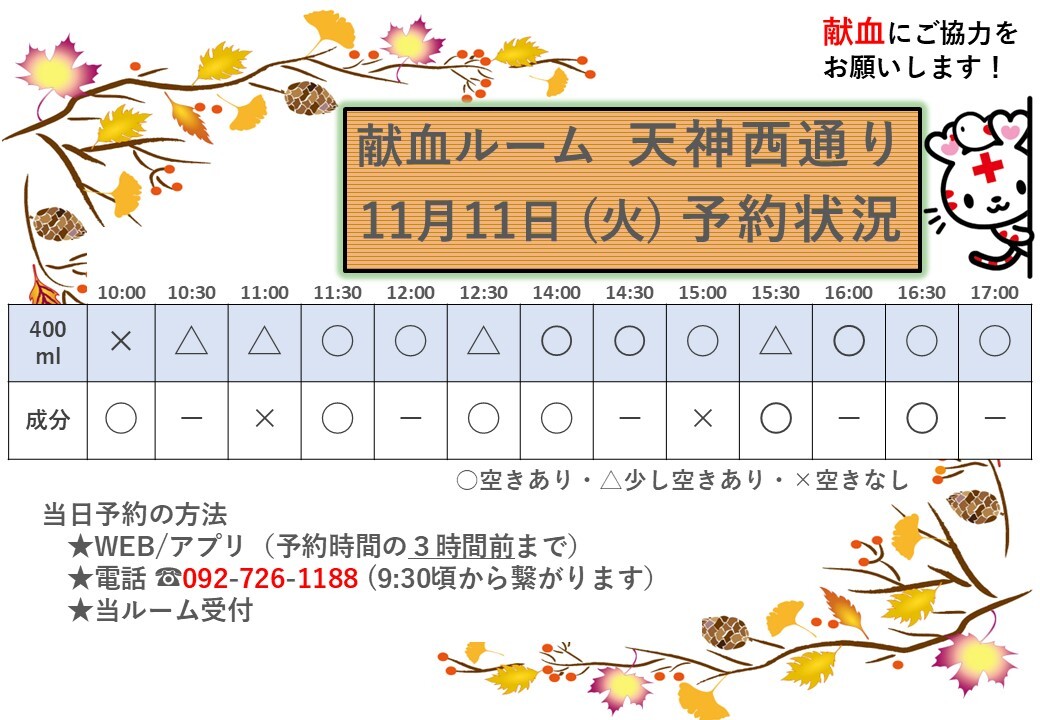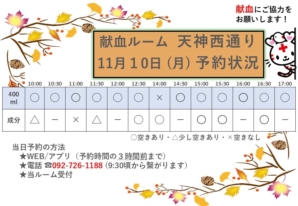 【献血ルーム天神西通り】 明日(11/10)のご予約状況です! 初めての方、お久しぶりの方も大歓迎🔰 平日限定の予約キャンペーンも実施中です🎁✨ #やってみらん献血 #福岡 pic.x.com/c8SYoWm1Sy