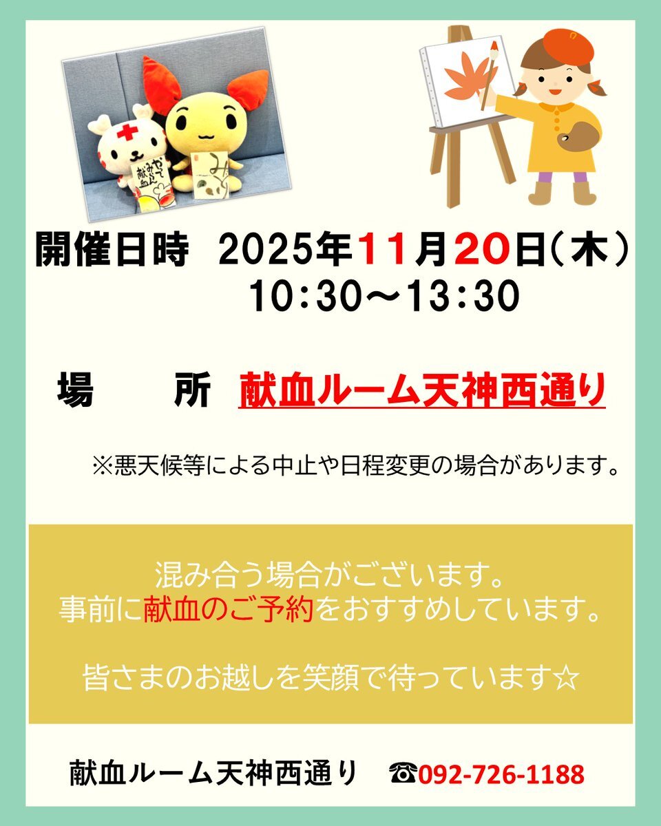 【献血ルーム 天神西通り】 本日(11/6)のご予約、全時間帯空きがあります🙂 平日キャンペーンも実施中💫 #天神 へお越しの際は、ぜひお立ち寄りください🙇♀️ #フォトスポット には #献血応援アンバサダー #岡澤アキラ さんのパネルを飾ってお待ちしてます✨ #やってみらん献血 #血小板 #AB型 pic.x.com/fwnCTcwGVh