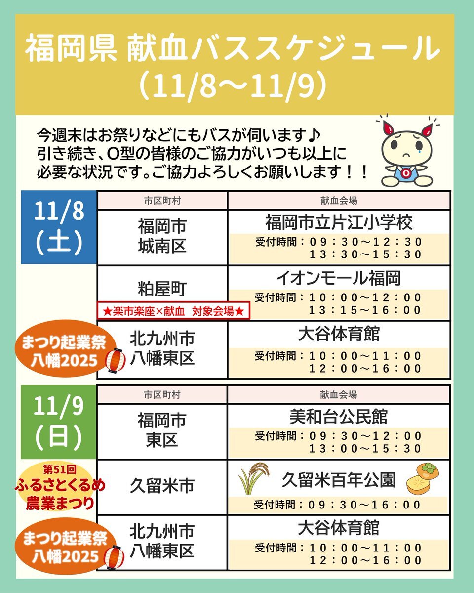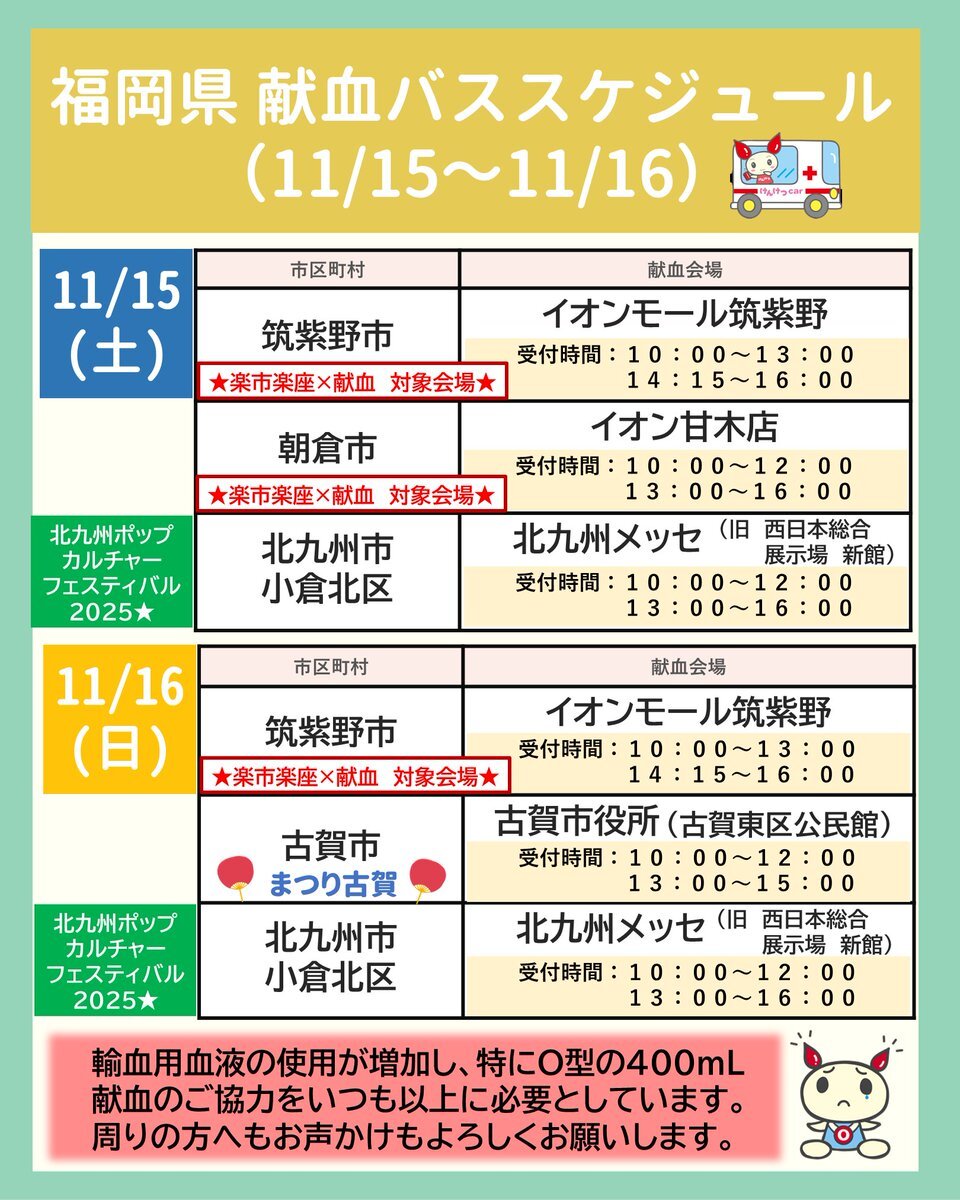 / 📢今週末の #献血 バスの運行情報🚌 \ 今週末は #北九州ポップカルチャーフェスティバル 開催🎤 会場で献血して頂いた方には 毎年大人気 オリジナル缶バッジのプレゼント😍 現在、特に #O型 の方の400mL献血を 必要としています🙏 周りの方にもぜひお声かけをお願いします🙇♀️ #やってみらん献血 pic.x.com/hlCu6rtiY4