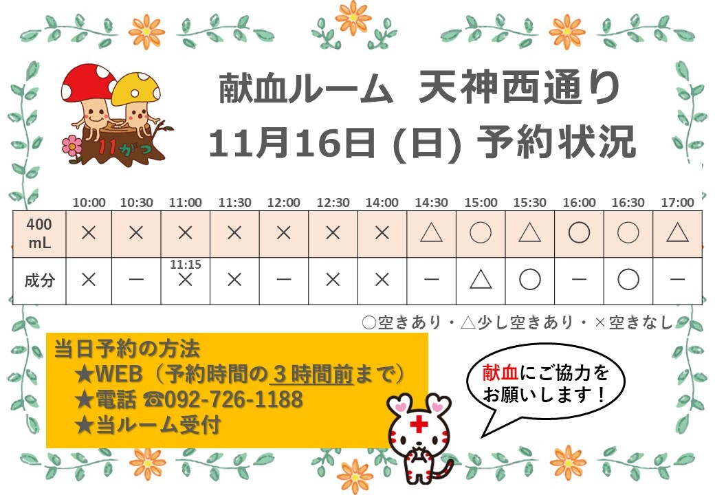 【献血ルーム天神西通り】 明日(11/15)のご予約状況です👇 週末のお買い物やお食事のついでに、ぜひお立ち寄りください🎁 お電話や #ラブラッド からご予約お待ちしております📱🩸 ☎092-726-1188 #やってみらん献血 pic.x.com/2LYuCPpQux