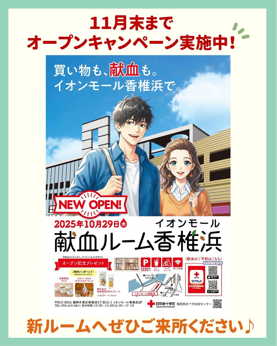 / 📣 ぜひお越しください‼️ \ 献血ルーム イオンモール香椎浜オープンから1週間。 おかげさまで多くの方にご来所いただいております😃 11月末までオープニングキャンペーン実施中❣️ ご来所の際はご予約がおススメです💁 買い物合間に #やってみらん献血 #福岡 #献血 #イオンモール香椎浜 pic.x.com/DzSElS3LSa