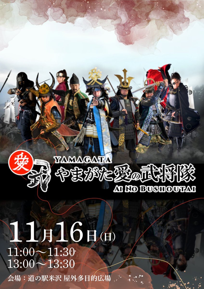 ⚔️イベント情報⚔️ #やまがた愛の武将隊 によるステージイベントを開催いたします🎉 山形の魅力がぎゅぎゅっと詰まった30分間!華麗な演武やトークショーをお楽しみいただけます。 皆様のご来館をお待ちしております✨ 日時:11/16(日) 11:00~11:30、13:00~13:30 場所:#道の駅米沢 屋外多目的広場 pic.x.com/UYs8zu1d03