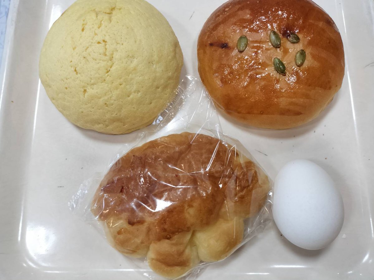 山スイーツINやま会①‼️ 前回同様ムラタさんでパンを調達🍞(写真1枚目) 2枚目左上のメロンパン、右上のかぼちゃのパン、下のクリームパン、なぜか茹で卵を購入しました~😋 茹で卵はスイーツ外ですが売っていたので買いました〜🥚😁 #やまくっくのやま会 #フレッシュベーカリームラタ pic.x.com/MHduKj62yx