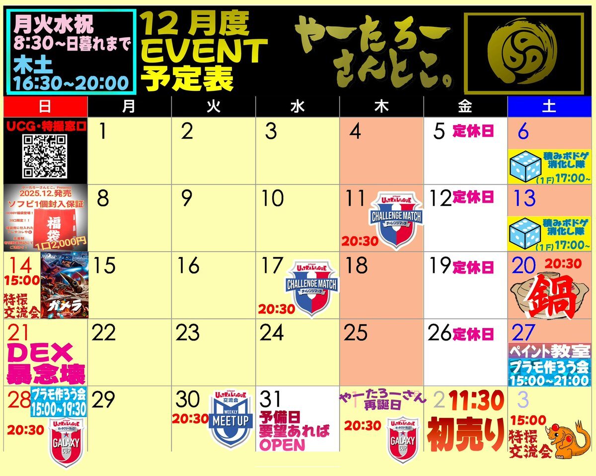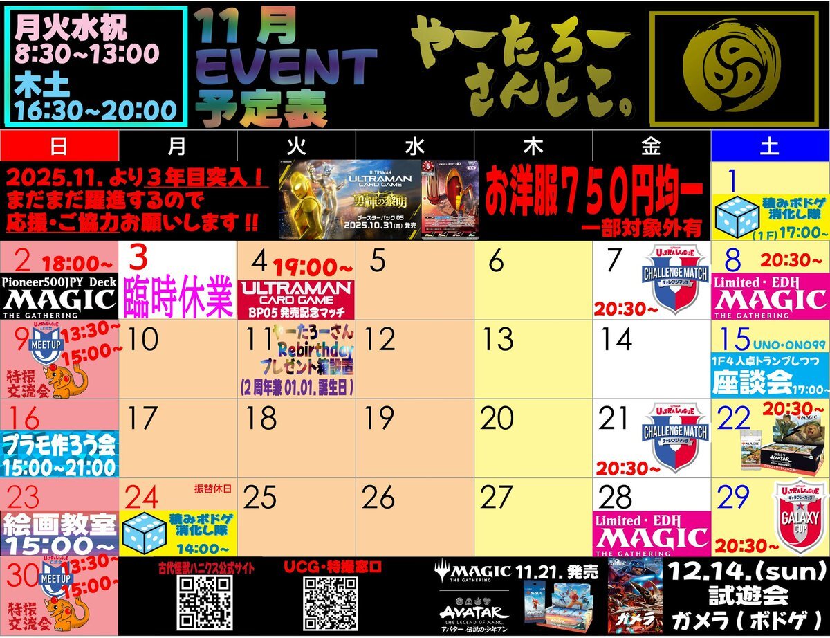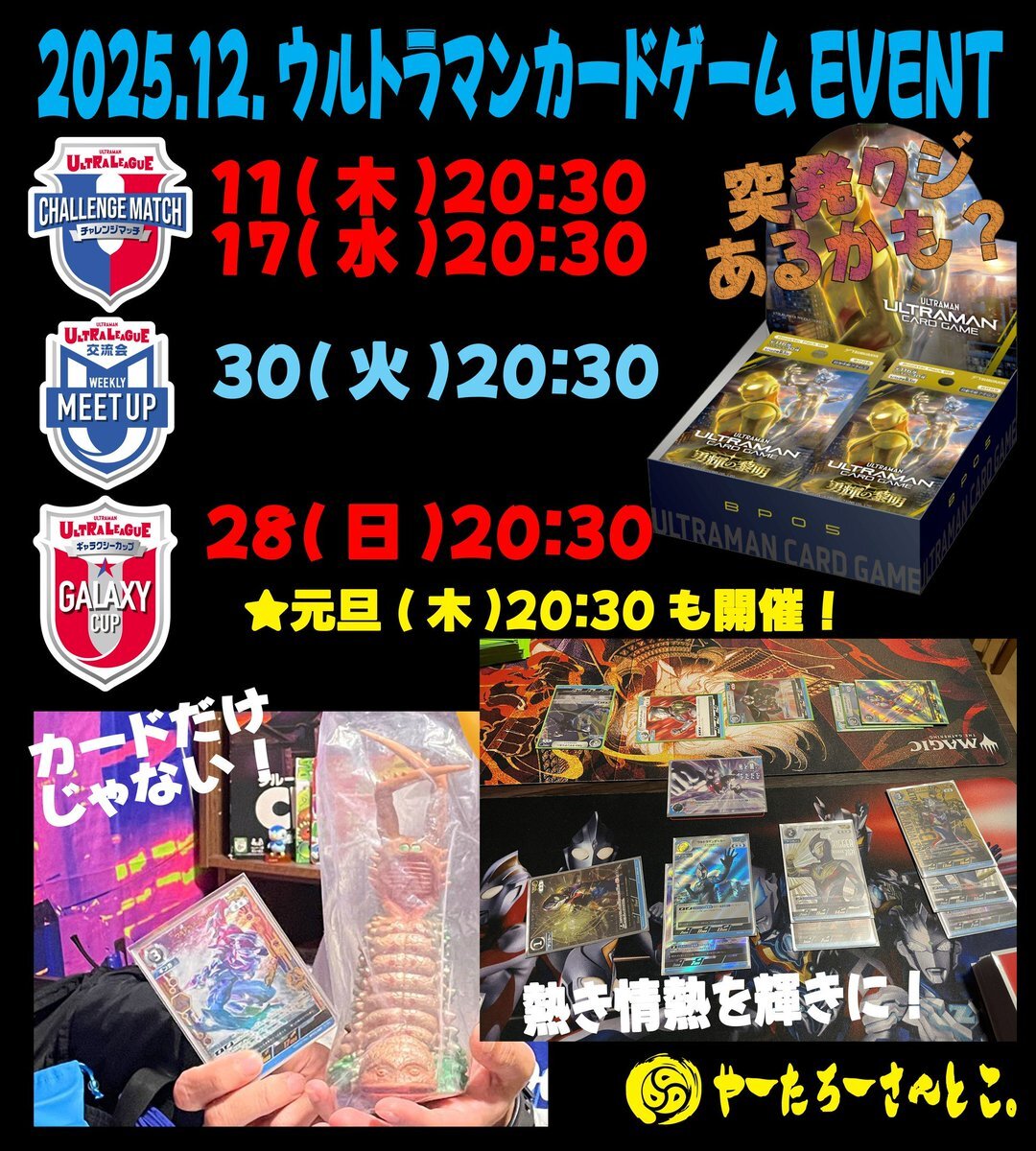 【12月Event表】 750円👕均一 たぶん年内❓ 12月上旬継続🔥 んで やーたろーさん誕生日箱いっぱいにして~🥺なくぞ! 🎲ボドゲ👕衣類🃏MTG #やーたろーさんとこ#mtgjp #堺区 #雑貨 #堺駅 #ソフビ #住吉橋町 #ボドゲ #ハニクス #EDH #特撮 #ゴジラ #UCG #ボドゲ #トレカ #TCG #ウルカ #交流会 #HOBBY pic.x.com/07SR9RTrlB