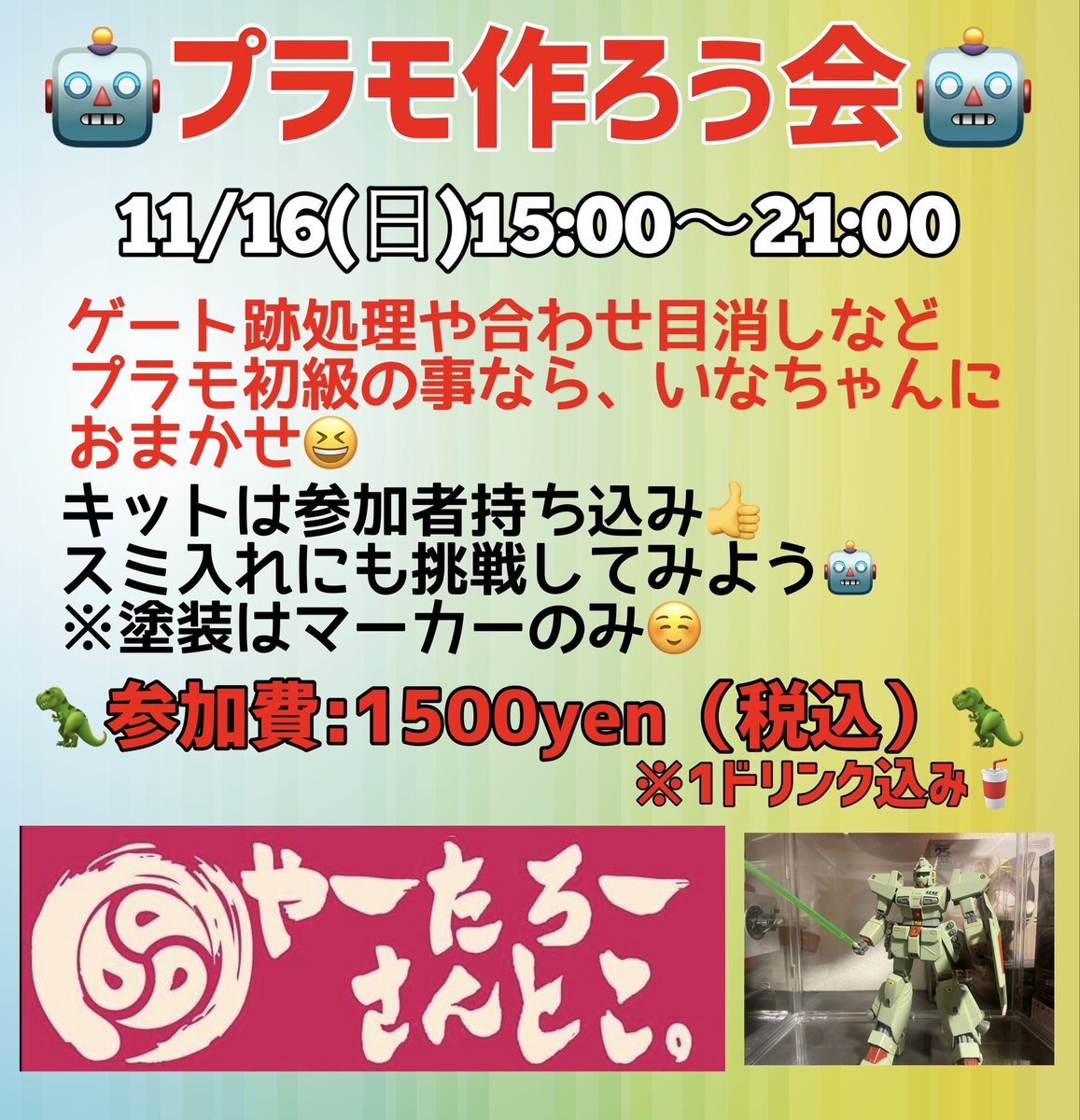 11/16(日) 15-21時 #プラモ作ろう会 積みプラ消化や、これからプラモ始めたい方はいかがですか❓ 初歩的な作り方は『いなちゃん』が教えませう☺️✨ 工具不要🛠️🪛 是非遊びに来てね😆 #やーたろーさんとこ#特撮 #ハニクス #ゴジラ #ウルトラマン #仮面ライダー #ガンダム pic.x.com/jXPFCTEXsz