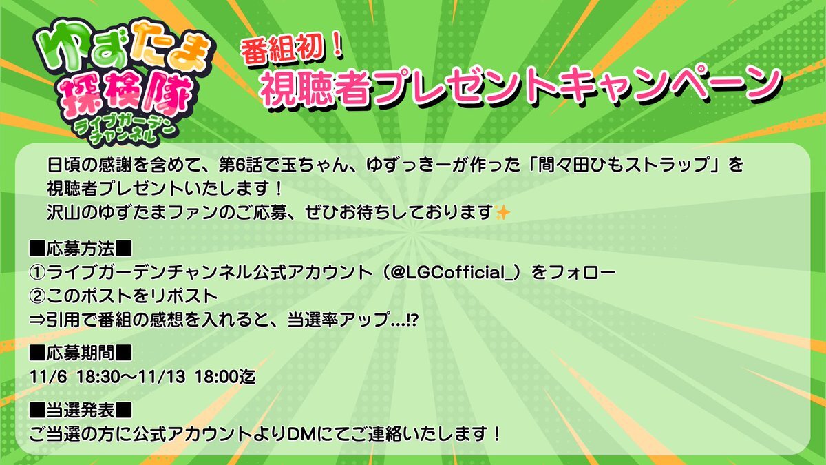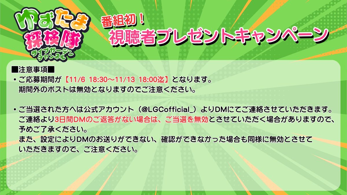 今回の #ゆずたま探検隊 は視聴者プレゼントあります😃 応募方法は下記ポストを参考にしてください☺️ どしどしお待ちしてますよー❣️ x.com/lgcofficial_/s…
