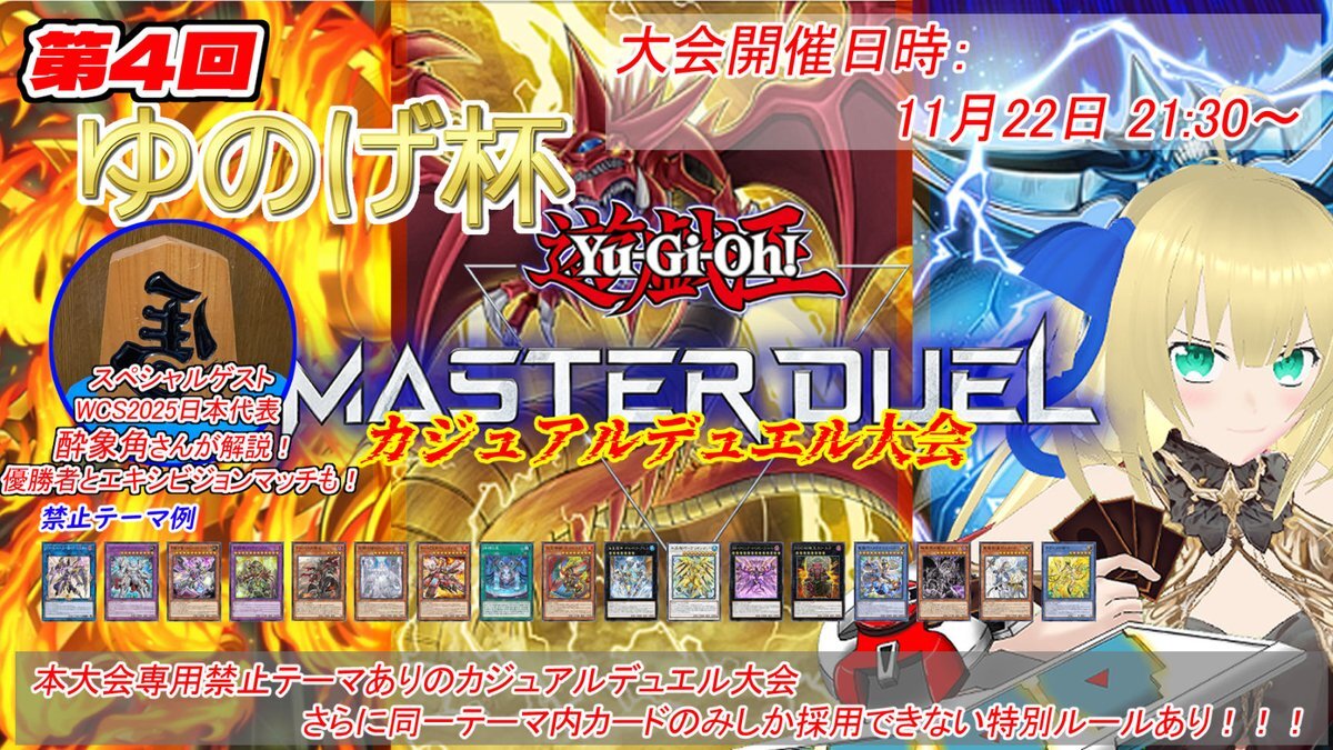 【告知】 第4回ゆのげ杯 カジュアルデュエル大会開催! 今大会のルールは同一テーマ内カードのみデッキ投入可能です!!! 君のお気に入りのテーマで優勝目指してみませんか? ▼開催日 11/29(土) 21:30~ ▼エントリーページ tonamel.com/competition/A6… #遊戯王マスターデュエル #ゆのげ杯 pic.x.com/X3UJl7OUeE