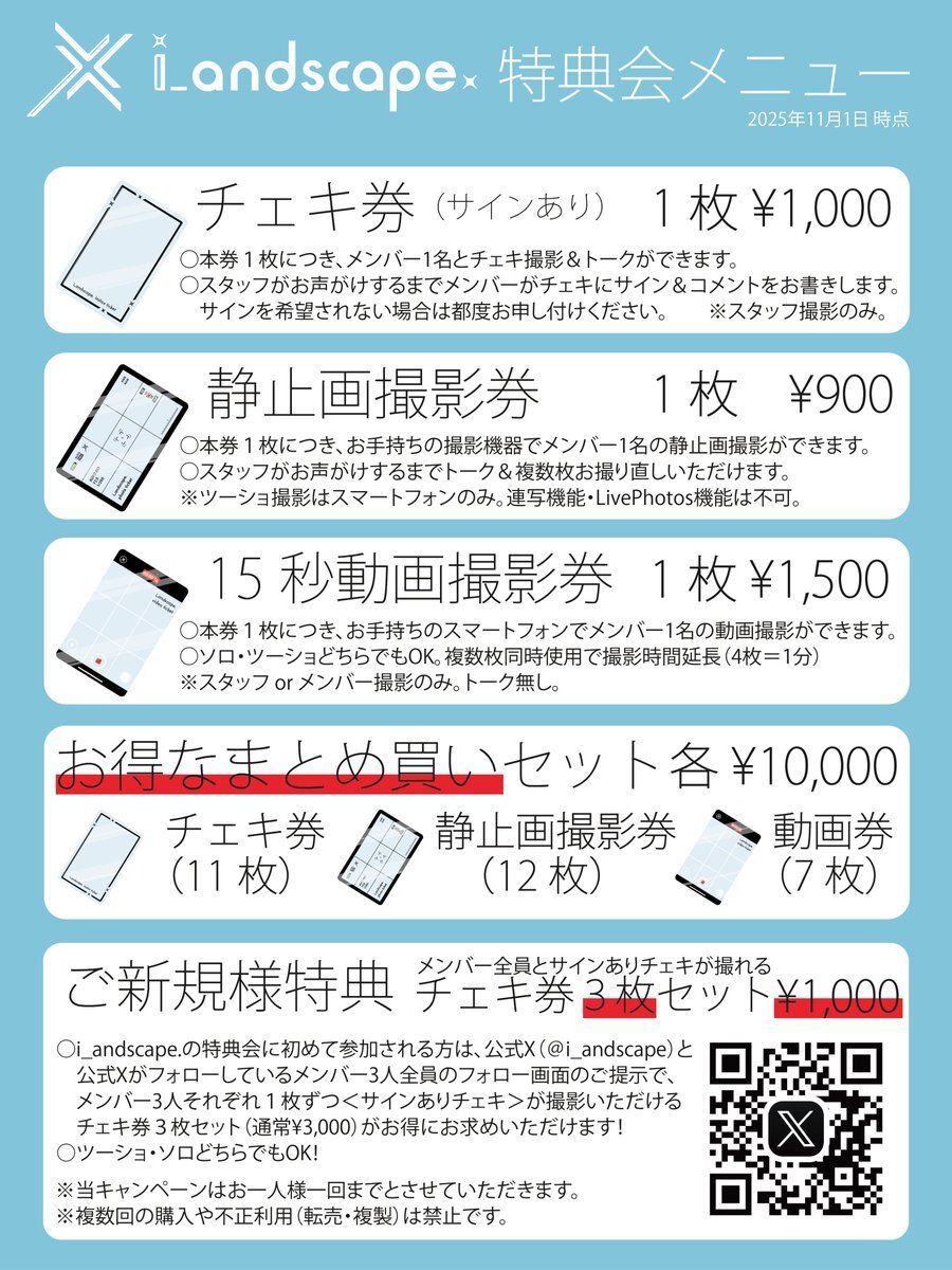 【特典会メニュー改訂・一部値下げのお知らせ】 いつも i_andscape. を応援いただき、誠にありがとうございます。 このたび、特典会メニューの内容をリニューアルいたしました。 新たに撮影メニューを追加し、より多彩にお楽しみいただける特典会となっております。 🎟️ x.com/i_andscape/sta…