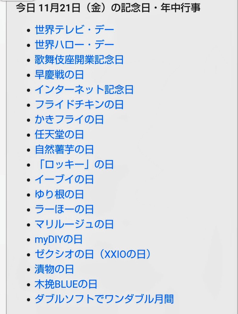 11月21日(金) おはようございます♡ 今日は #世界テレビデー #世界ハローデー #早慶戦の日 #歌舞伎座開業記念日 #インターネット記念日 #フライドチキンの日 #かきフライの日 #任天堂の日 #自然薯芋の日 #ロッキーの日 #イーブイの日 #ゆり根の日 #ラーほーの日 #漬物の日 です pic.x.com/JGi4Fk2qWV
