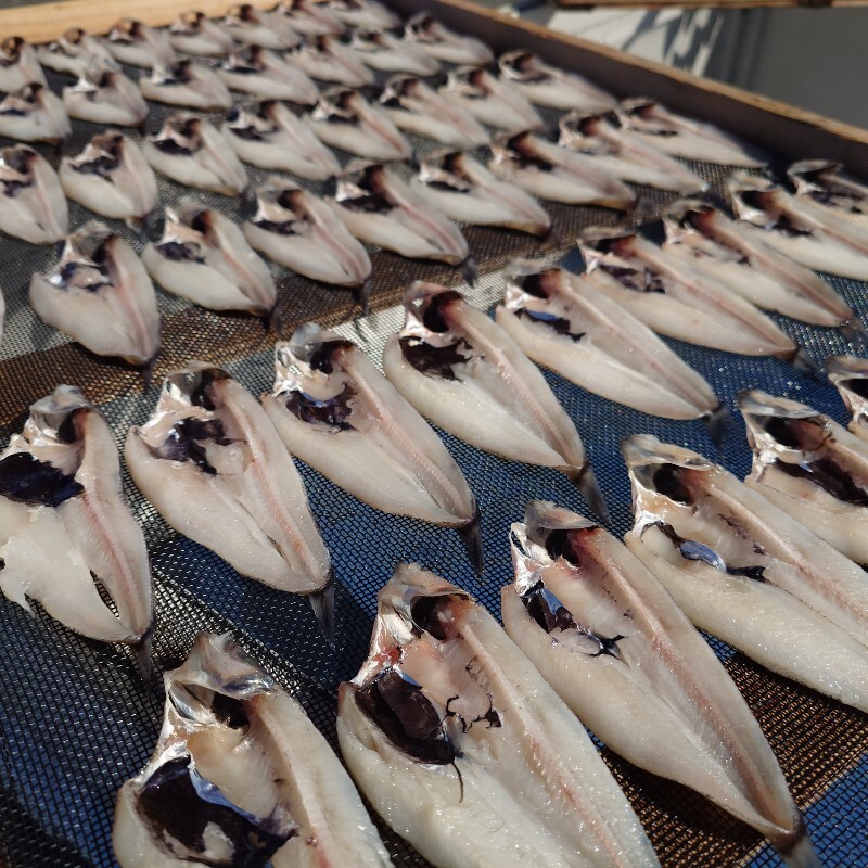 晴天の大津漁港。ほどよく北風が吹いて絶好の干物日和です。湿度も低いしすぐ仕上がるでしょう。画像はめひかり開き干し #めひかり開き #まるむら商店 #北茨城市 #ようそろー物産館 pic.x.com/kOgqZ70glL