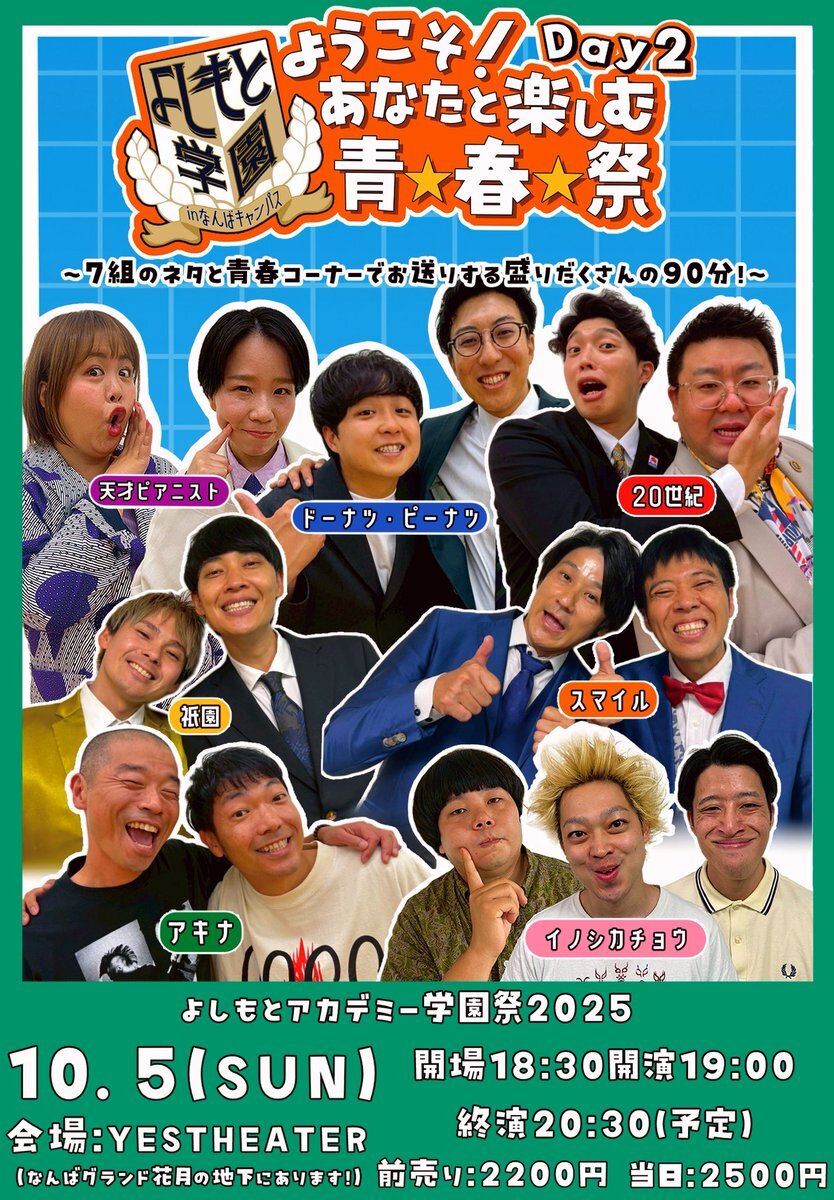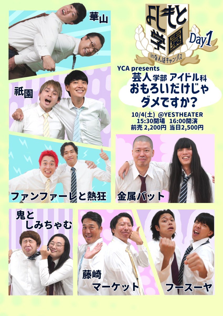 大阪校 学園祭ビジュアルデータ📢 10月4日(土)5日(日)にイエスシアターにて開催されます、#よしもとクリエイティブアカデミー 大阪校主催ライブのビジュアルデータです😍 生徒の皆さんが、今回のイベント限定出演者写真を撮影し制作しました📷 🎫絶賛発売中 お得な2日間通し券もございます! pic.x.com/ZR1XTmkX8o