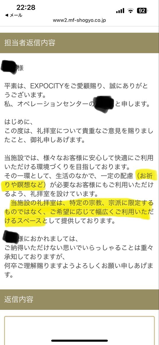 大阪府吹田市にある、ららぽーとエキスポシティの礼拝室は、特定の宗教のためのものじゃないらしいので、「希望に応じて幅広く利用して良い」らしいです。 幅広い目的で利用しましょう。 #礼拝室 #ららぽーとエキスポシティ pic.x.com/VKvpGOpIUZ