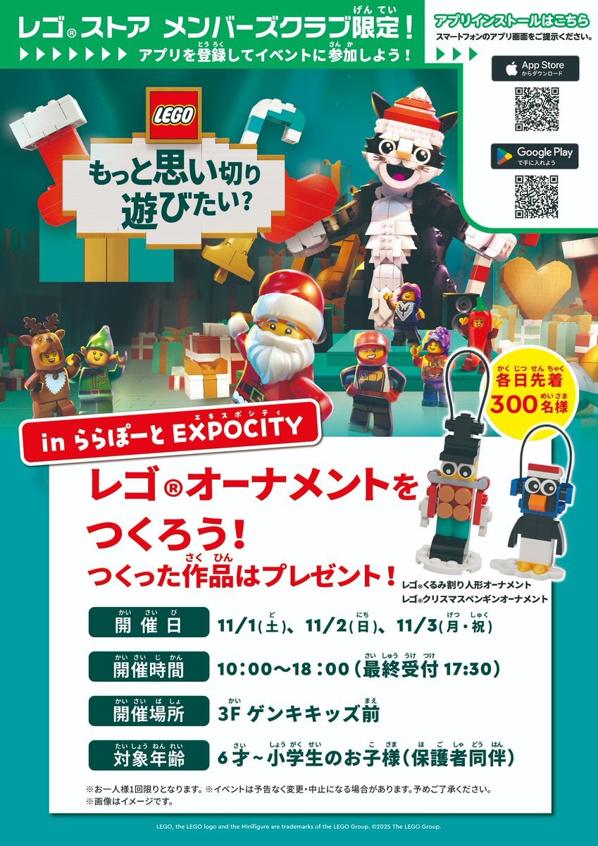11月1(土)10:00~【レゴ®オーナメントをつくろう!】イベントやるよ~😄💕#レゴストア #ららぽーとエキスポシティ 3Fゲンキキッズ前😻🎵 参加してくれたおともだちには作ったキットをプレゼント!🎁 レゴ®ブロックのイベントに参加して楽しい思い出をつくろう!👏✨ #レゴ pic.x.com/mo8ABeSs8D
