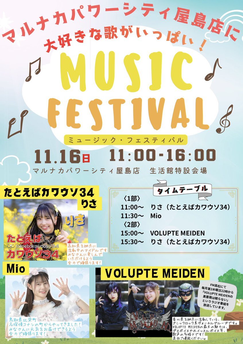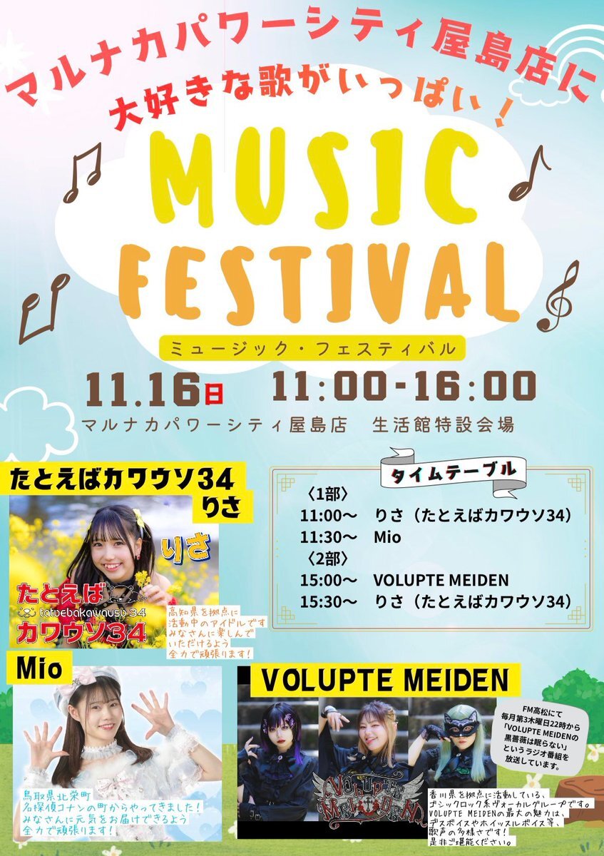 【イベント出演情報】 11/16(日) 『MUSIC FESTIVAL』 📍マルナカパワーシティ屋島店 (香川県高松市屋島西町字百石1907-1 ) ⏰11:00〜16:00 観覧無料🆓✨ 是非お越しください‼️‼️