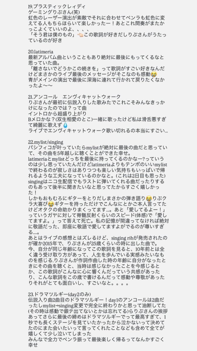 りぶわん Into the Abyss 2daysの曲とかMCの感想レポなど 専垢banで死んでるのでこっちにも残しておきます 数日経ってから書いたためオタクの幻覚あったらすみません💧 1/2 #りぶ15thライブ pic.x.com/eJWUQl9kii
