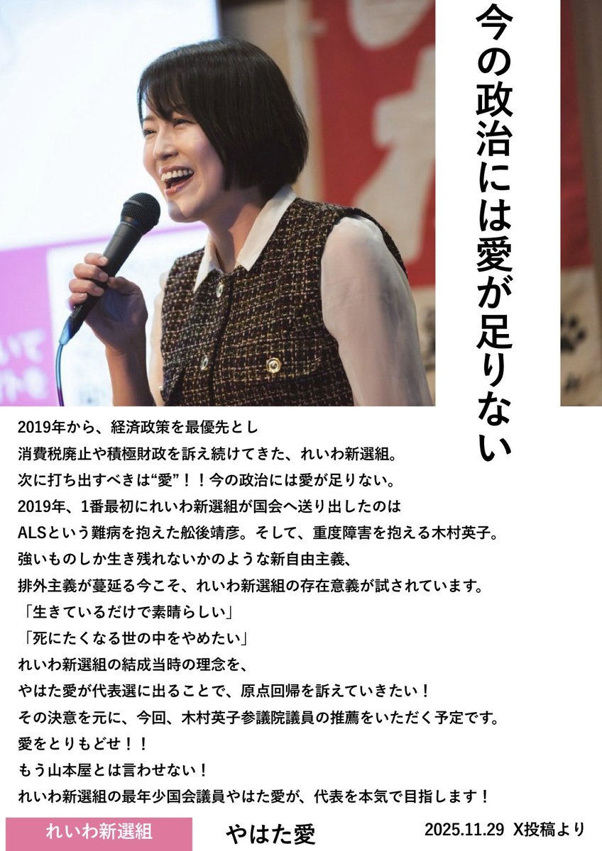 【やはた愛❤️代表選挙に出馬します】 2019年から、経済政策を最優先とし消費税廃止や積極財政を訴え続けてきた、れいわ新選組。 次に打ち出すべきは“愛”!! 今の政治には愛が足りない。 2019年、1番最初にれいわ新選組が国会へ送り出したのはALSという難病を抱えた舩後靖彦。