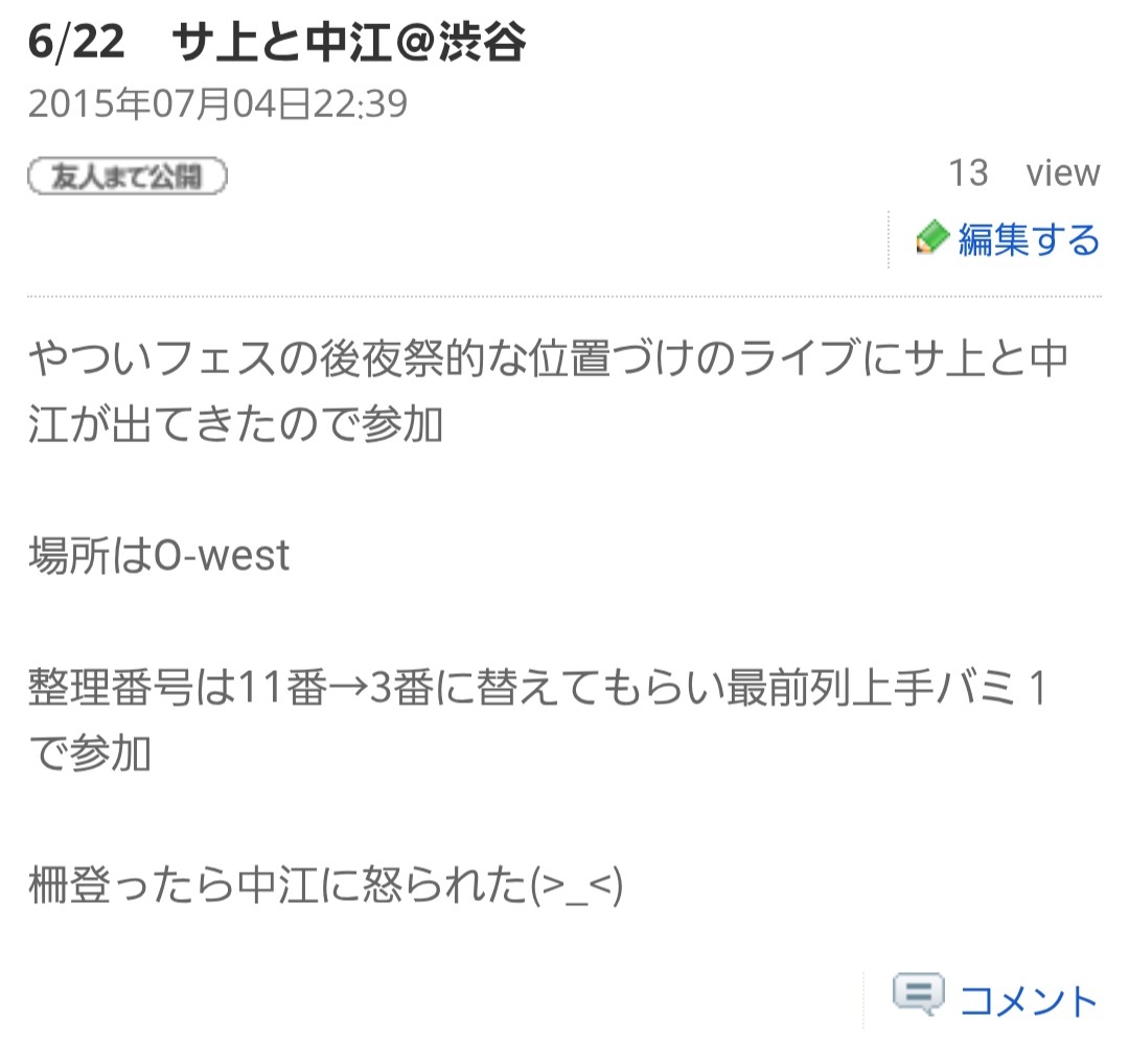 #ろいずのつぶや記 2015.6.22【東京】survive to the future(サ上と中江) 会場 : TSUTAYA O-WEST 柵のぼったら、中江に怒られたとあるけど、酒盛りして演者に怒られたというのもある(笑)。そのくらい、フリーダムな現場でした😂 pic.x.com/LkPlVClsx7