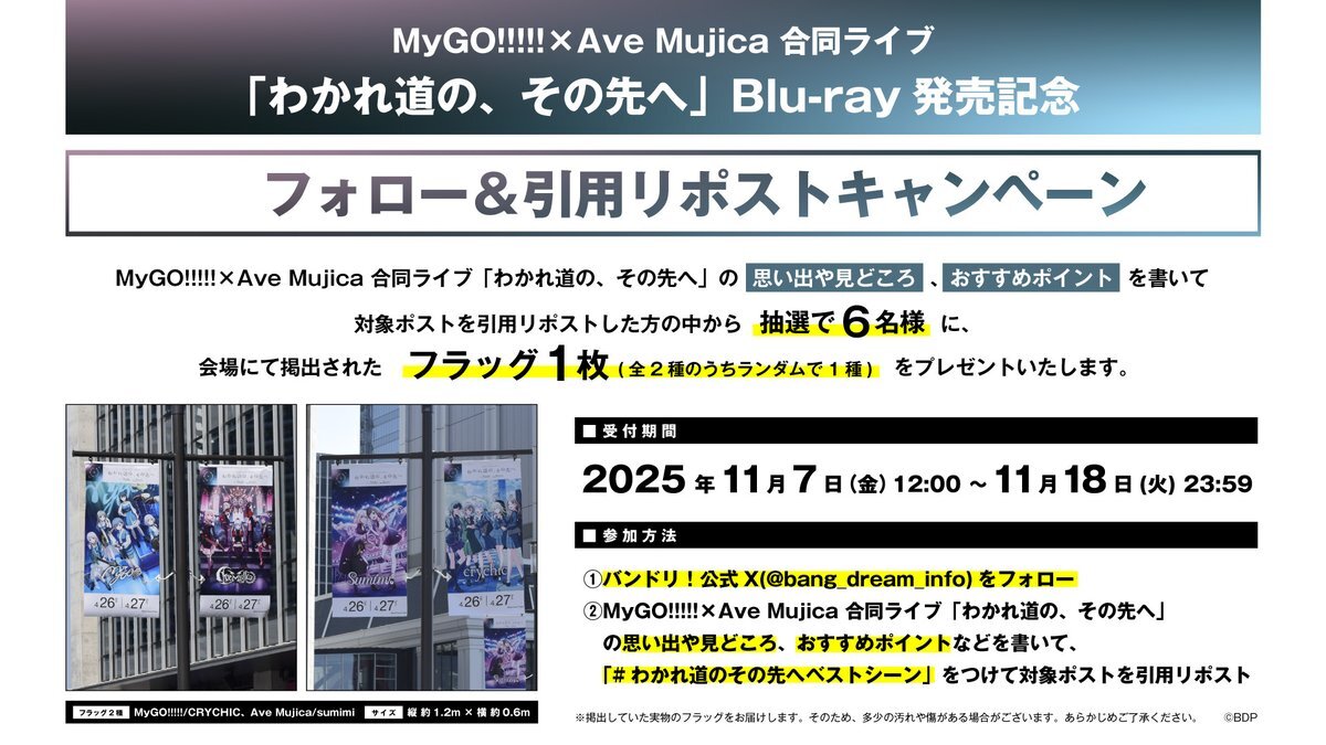 \フォロー&引用リポストキャンペーン開催🎉/ 抽選で6名様に 会場にて掲出されたフラッグをプレゼント🎁 📌参加方法 ①#バンドリ 公式X(@bang_dream_info)をフォロー ②MyGO!!!!!×Ave Mujica 合同ライブ「#わかれ道のその先へ」の 思い出や見どころ・おすすめポイントを書き、
