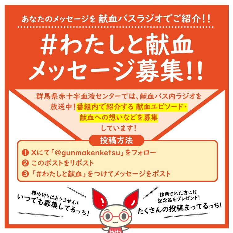 \あなたのメッセージを献血バスラジオでご紹介!/ #わたしと献血 メッセージ募集❗️ #群馬 県内の #献血 バスの中だけで聴ける、けんけつラジオぐんま(仮)がスタート! 番組内で紹介する #献血エピソード#献血への想い などを募集しています。 詳しくは🔽 bs.jrc.or.jp/ktks/gunma/202… pic.x.com/ko35rn0ZdI