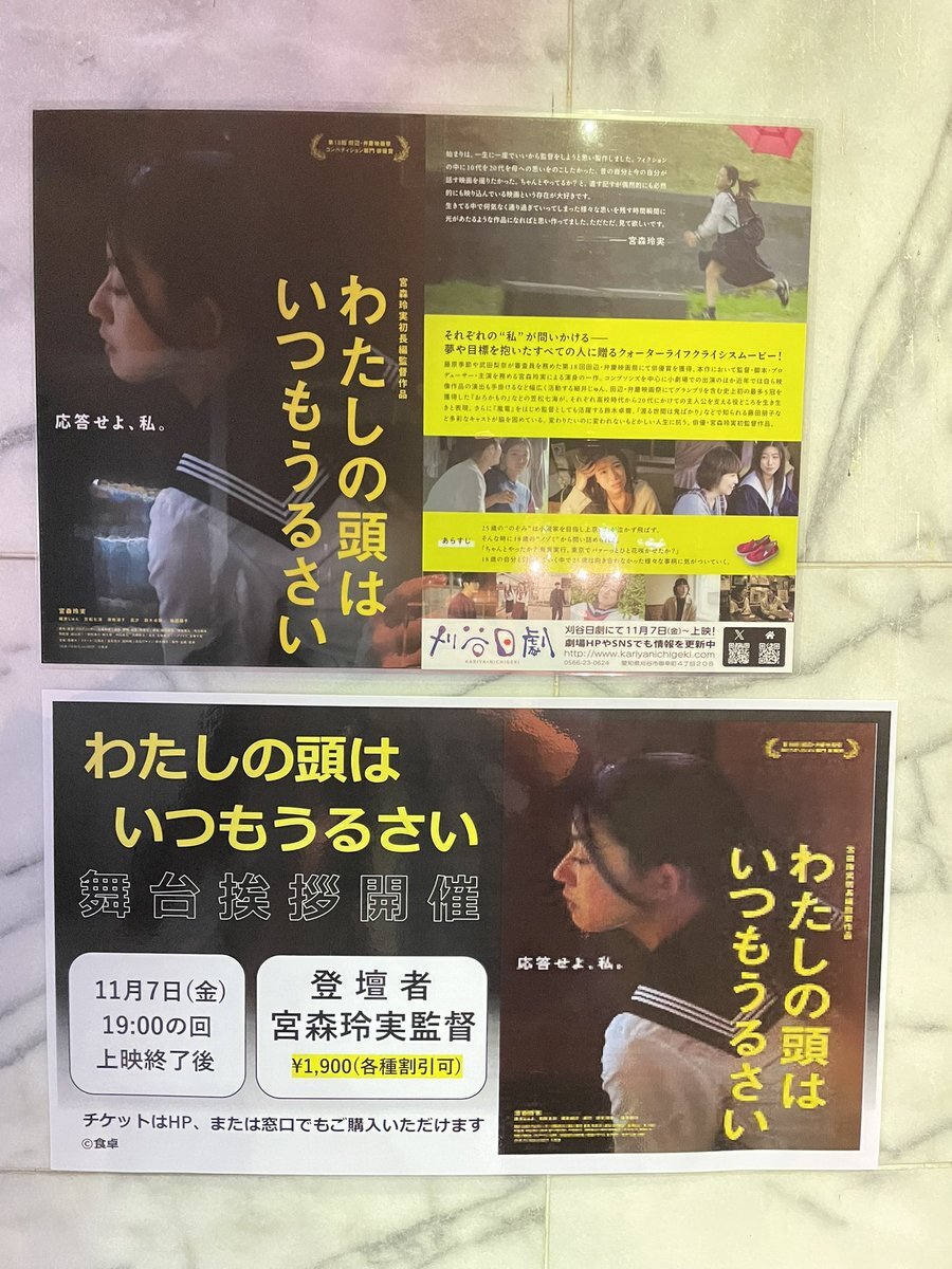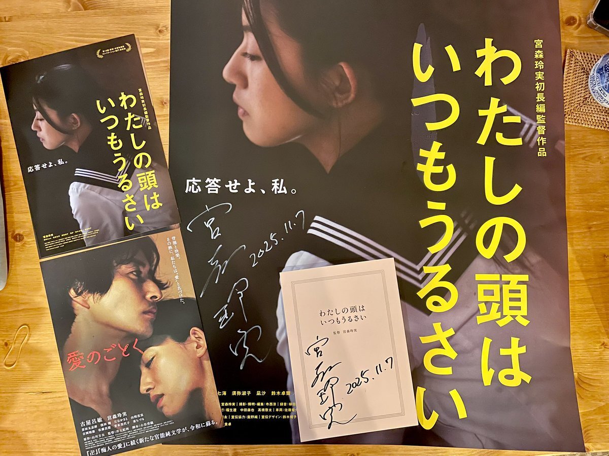 村田唯監督の『#密かな吐息』の舞台挨拶に登壇された宮森さんから来年1月23日に池袋新文芸坐で公開される主演映画『#愛のごとく』のチラシと素敵な笑顔をいただきました また、監督・主演の『#わたしの頭はいつもうるさい』は12月にユーロスペースでの公開も予定されているそうです 行かなきゃ💦 pic.x.com/zwWw6FGpTl