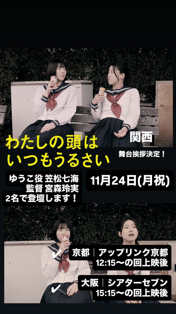 『わたしの頭はいつもうるさい』 【関西上映イベント情報】 🗓️ 11/24月祝 京都/アップリンク京都@uplink_kyoto 12:15の回上映後 大阪/シアターセブン@juso_theater7 15:15の回上映後 本作監督主演の宮森玲実とゆうこ役笠松七海の上映後舞台挨拶を行います。久々の二人トークです!