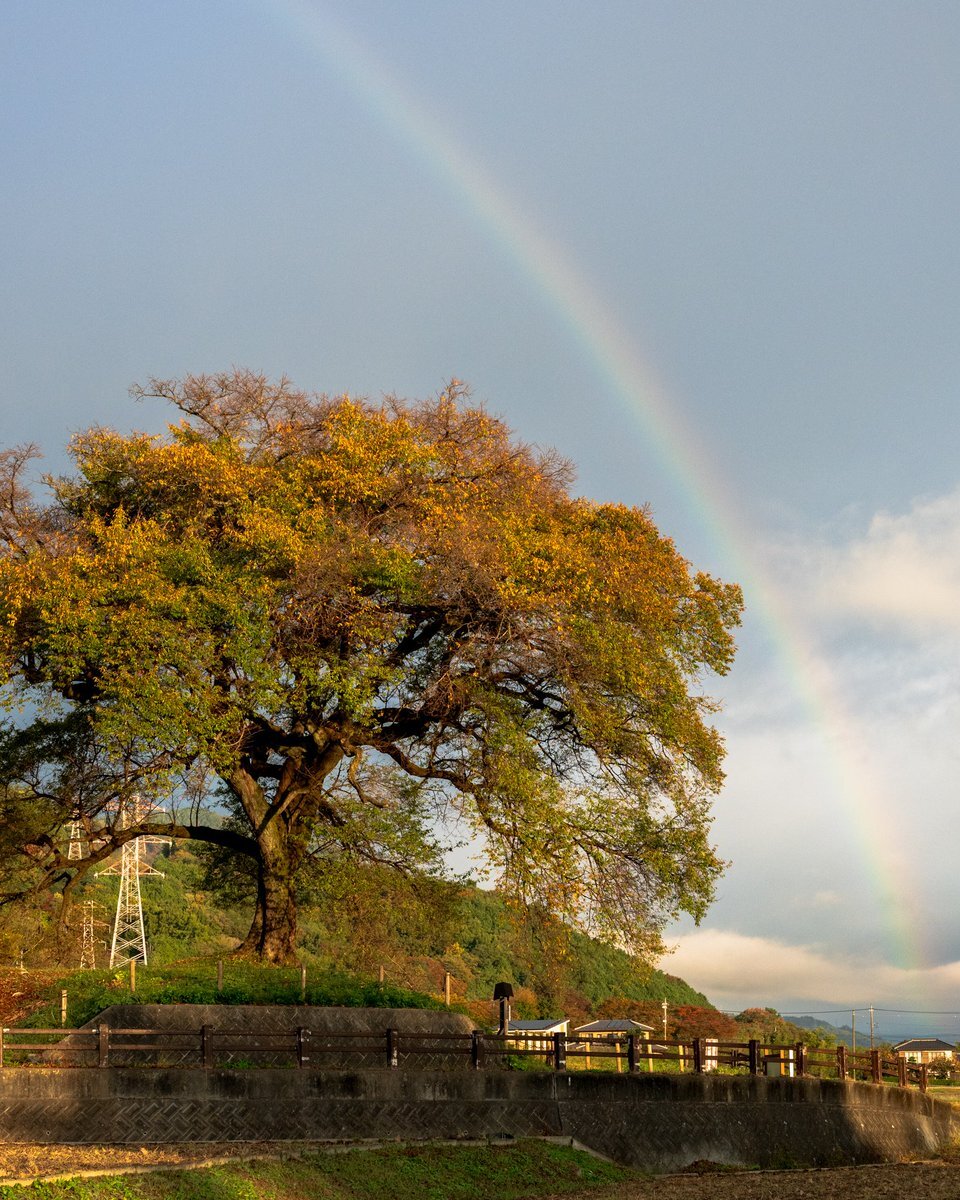 秋のわに塚と虹 北西側の山沿いはしぐれて雨降り 朝陽に照らされ大きな虹が現れました。 黄葉のわに塚のサクラと🌈🌸🍁 昨朝撮影 #わに塚のサクラ # #Nikon pic.x.com/edK6FOZxpj