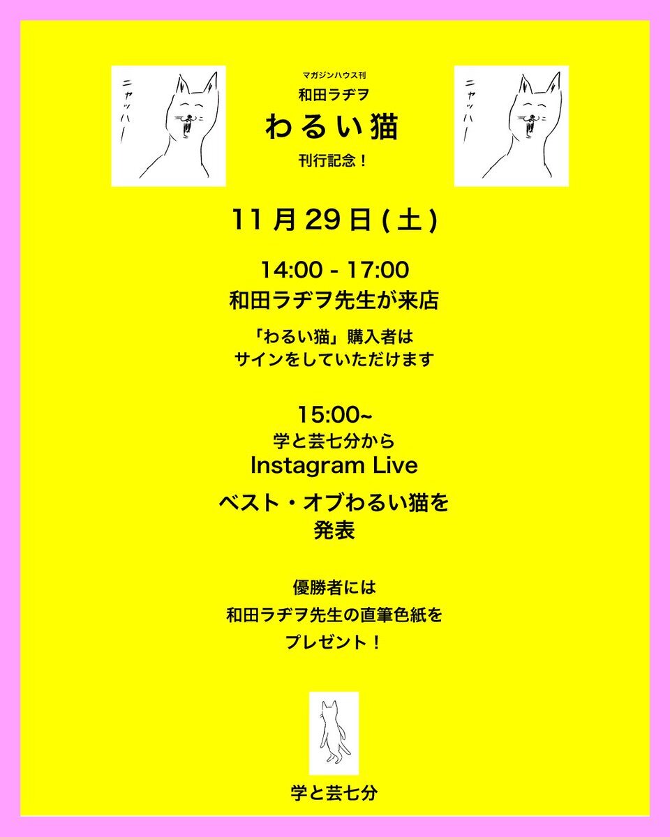 【11/29 本日】 「わるい猫」刊行イベント 学と芸 七分から15時〜インスタライブ予定 七分アカウント instagram.com/nanabu_7/ 14時〜17時 在廊しております。 よろしくお願いいたします! #わるい猫 #grc797 pic.x.com/UryjdzXz4v