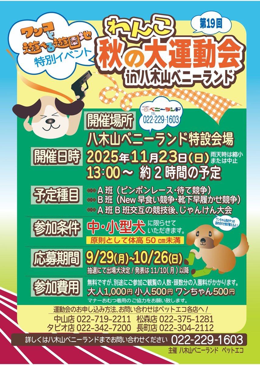 11月23日(日)の『#ワンコと遊べる遊園地』では、『#わんこ秋の大運動会』も開催。 応募お申し込みは10月26日(日)まで、ペットエコさんの各店にお願いします。 #仙台 #遊園地 #八木山ベニーランド #わんこ秋の大運動会 #家族でお出かけ #子どもづれ #ペットエコ #宮城 #わんこ秋の大運動会 pic.x.com/TXf0ZhsT4B