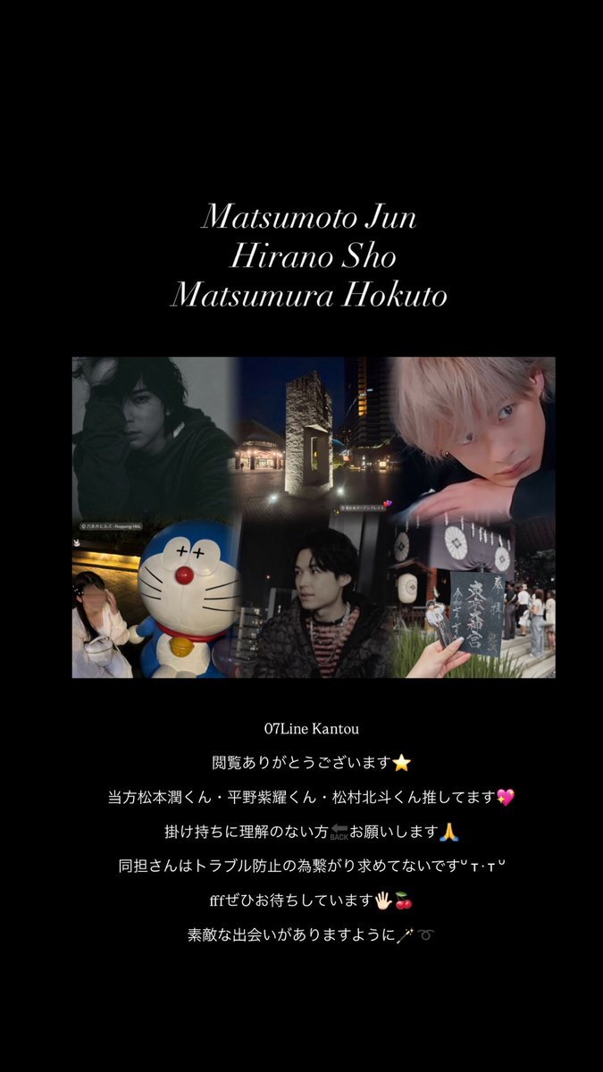 嵐|松本潤 Nunber_i |平野紫耀 SixTONES|松村北斗 同担さんはトラブル防止の為繋がり求めてないです(ˆт · тˆ) 詳しくはリトリンご覧ください✨ lit.link/Yuk7 #わーーーージャニオタさんと繋がるお時間がまいりました #あらしっくと繋がりたい #iLYsと繋がりたい #スト担と繋がりたい pic.x.com/gQZjdYcczg